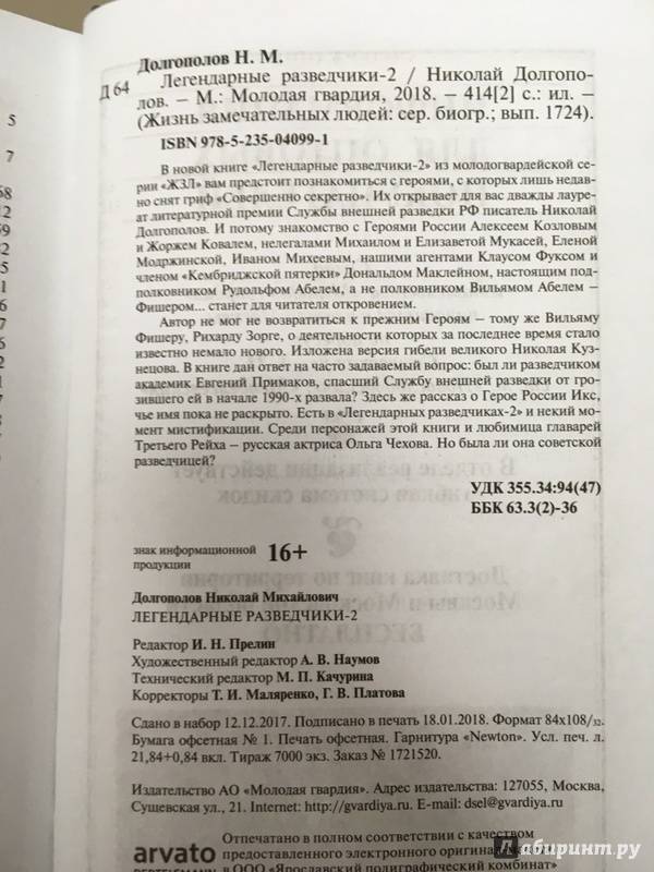 ОписаниеВ новой книге "Легендарные разведчики-2" из молодогвардейской серии "ЖЗЛ" вам предстоит познакомиться с героями, с которых лишь недавно снят гриф "Совершенно секретно". Их открывает для вас дважды лауреат литературной премии Службы внешней разведки РФ писатель Николай Долгополов. И потому знакомство с Героями России Алексеем Козловым и Жоржем Ковалем, нелегалами Михаилом и Елизаветой Мукасей, Еленой Модржинской, Иваном Михеевым, нашими агентами Клаусом Фуксом и членом "Кембриджской пятерки" Дональдом Маклейном, настоящим подполковником Рудольфом Абелем, а не полковником Вильямом Абелем - Фишером… станет для читателя откровением.Автор не мог не возвратиться к прежним Героям - тому же Вильяму Фишеру, Рихарду Зорге, о деятельности которых за последнее время стало известно немало нового. Изложена версия гибели великого Николая Кузнецова. В книге дан ответ на часто задаваемый вопрос: был ли разведчиком академик Евгений Примаков, спасший Службу внешней разведки от грозившего ей в начале 1990-х развала? Здесь же рассказ о Герое России Икс, чье имя пока не раскрыто. Есть в "Легендарных разведчиках-2" и некий момент мистификации. Среди персонажей этой книги и любимица главарей Третьего Рейха - русская актриса Ольга Чехова. Но была ли она советской разведчицей?4-е издание.СвернутьВ новой книге "Легендарные разведчики-2" из молодогвардейской серии "ЖЗЛ" вам предстоит познакомиться с героями, с которых лишь недавно снят гриф "Совершенно секретно". Их открывает для вас дважды лауреат литературной премии Службы внешней разведки РФ писатель Николай Долгополов. И потому знакомство с Героями России Алексеем Козловым и Жоржем Ковалем, нелегалами Михаилом и Елизаветой Мукасей, Еленой Модржинской, Иваном Михеевым, нашими агентами Клаусом Фуксом и членом "Кембриджской пятерки" Дональдом Маклейном, настоящим подполковником Рудольфом Абелем, а не полковником Вильямом Абелем - Фишером… станет для читателя откровением.Автор не мог не возвратиться к прежним Героям - тому же Вильяму Фишеру, Рихарду Зорге, о деятельности которых за последнее время стало известно немало нового. Изложена версия гибели великого Николая Кузнецова. В книге дан ответ на часто задаваемый вопрос: был ли разведчиком академик Евгений Примаков, спасший Службу внешней разведки от грозившего ей в начале 1990-х развала? Здесь же рассказ о Герое России Икс, чье имя пока не раскрыто. Есть в "Легендарных разведчиках-2" и некий момент мистификации. Среди персонажей этой книги и любимица главарей Третьего Рейха - русская актриса Ольга Чехова. Но была ли она советской разведчицей?4-е издание.СвернутьСвернуть