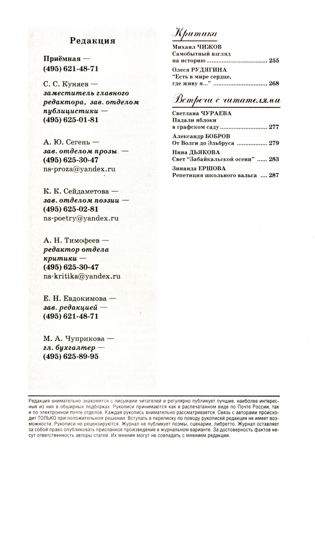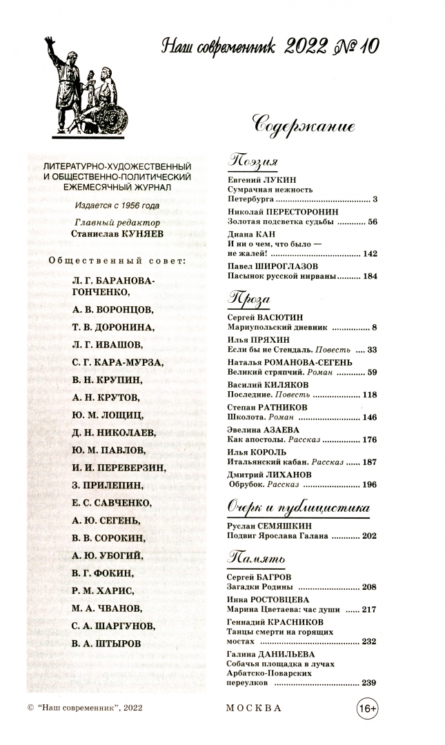 ОписаниеЖурнал "Наш современник" основан в 1956 году. Его ведущими авторами были Валентин Распутин, Василий Белов, Василий Шукшин, Вадим Кожинов, Виктор Астафьев, Гавриил Троепольский, Валентин Пикуль, Игорь Шафаревич и многие другие известнейшие писатели и публицисты России. Вот уже более четверти века журнал возглавляет Станислав Юрьевич Куняев. Ныне в журнале работают и постоянно публикуются Александр Казинцев, Сергей Куняев, Александр Сегень, Евгений Шишкин, Станислав Зотов. Авторами журнала сейчас являются Захар Прилепин, Роман Сенчин, Сергей Шаргунов, Александр Проханов, Михаил Тарковский, Валерий Ганичев, Владимир Бушин, Андрей Фурсов и многие другие известные современные писатели и публицисты. Журнал неизменно уделяет внимание творчеству молодых авторов.Проза журнала "Наш современник" постоянно на передовой, постоянно в борьбе, неутомимо отражает атаки со стороны меняющейся, и далеко не всегда в лучшую сторону, действительности. Рассказывают ли авторы о далёких временах нашей истории, о недавних событиях, на которые чрезмерно богат был век ХХ, или же ведут честный разговор о сегодняшнем дне, всё это всегда звучит современно и своевременно. В центре повествования рассказов, повестей, новелл и романов - русский человек во всех его проявлениях, как героических, так и неприглядных, как светлых, так и тёмных. Со страниц прозы журнал привык говорить истину как "царям", так и народу. И на смену уходящим старшим поколениям приходят молодые - будущие Беловы и Распутины, Шолоховы и Шукшины, Носовы и Прохановы. Те, кто смело выходит в бурное море нынешней литературной жизни России и мира.Публицистика журнала "Наш современник" всегда отличалась своей боевитостью и актуальностью, вскрытием самых серьёзных проблем современного мира, глубоким анализом исторических процессов, философскими обобщениями. Журнал стоит на русской национальной почве, и с помощью самобытного взгляда на мир раскрывает и анализирует сложные процессы, идущие в обществе. Не сглаживать проблемы, а пытаться со всей ответственностью говорить на самые острые темы, поднимать самые острые вопросы - вот кредо журнала. Именно такая публицистика и снискала себе заслуженную признательность и интерес читательской аудитории.Вот уже более четверти века отдел публицистики журнала возглавляет аналитик и политолог, автор многих проблемных книг и статей Александр Иванович Казинцев. Благодаря, во многом, его усилиям, журнал "Наш современник" стал особо дорог читателям своей бескомпромиссной и ясной идейной позицией, направленной, прежде всего, на защиту русских национальных интересов.СвернутьЖурнал "Наш современник" основан в 1956 году. Его ведущими авторами были Валентин Распутин, Василий Белов, Василий Шукшин, Вадим Кожинов, Виктор Астафьев, Гавриил Троепольский, Валентин Пикуль, Игорь Шафаревич и многие другие известнейшие писатели и публицисты России. Вот уже более четверти века журнал возглавляет Станислав Юрьевич Куняев. Ныне в журнале работают и постоянно публикуются Александр Казинцев, Сергей Куняев, Александр Сегень, Евгений Шишкин, Станислав Зотов. Авторами журнала сейчас являются Захар Прилепин, Роман Сенчин, Сергей Шаргунов, Александр Проханов, Михаил Тарковский, Валерий Ганичев, Владимир Бушин, Андрей Фурсов и многие другие известные современные писате