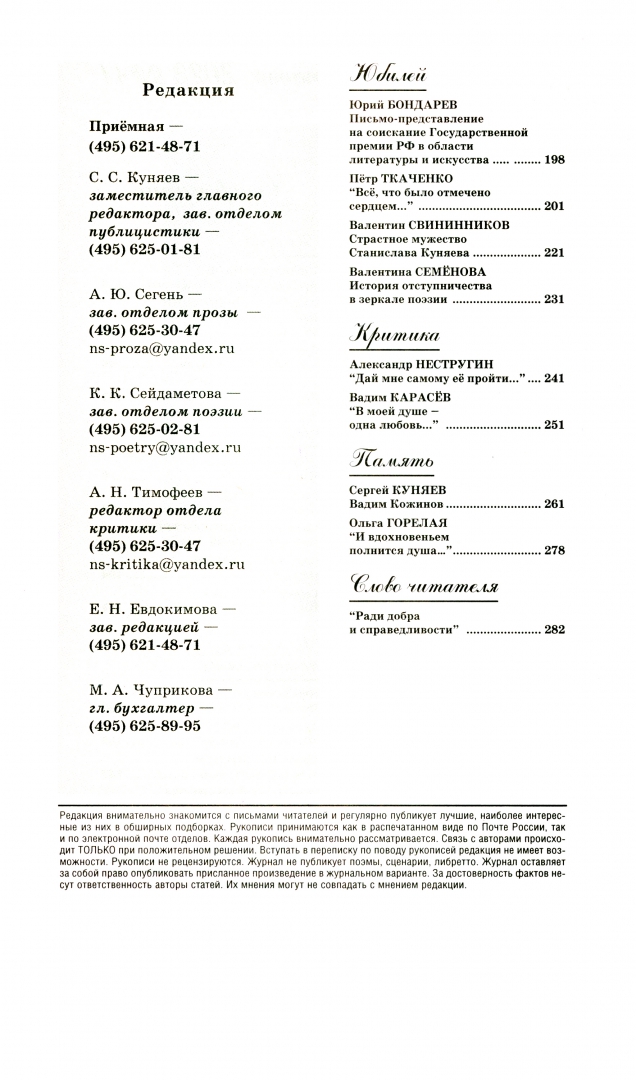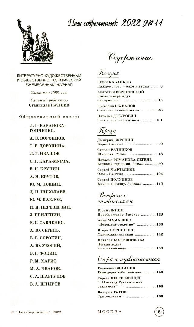 ОписаниеЖурнал "Наш современник" основан в 1956 году. Его ведущими авторами были Валентин Распутин, Василий Белов, Василий Шукшин, Вадим Кожинов, Виктор Астафьев, Гавриил Троепольский, Валентин Пикуль, Игорь Шафаревич и многие другие известнейшие писатели и публицисты России. Вот уже более четверти века журнал возглавляет Станислав Юрьевич Куняев. Ныне в журнале работают и постоянно публикуются Александр Казинцев, Сергей Куняев, Александр Сегень, Евгений Шишкин, Станислав Зотов. Авторами журнала сейчас являются Захар Прилепин, Роман Сенчин, Сергей Шаргунов, Александр Проханов, Михаил Тарковский, Валерий Ганичев, Владимир Бушин, Андрей Фурсов и многие другие известные современные писатели и публицисты. Журнал неизменно уделяет внимание творчеству молодых авторов.Проза журнала "Наш современник" постоянно на передовой, постоянно в борьбе, неутомимо отражает атаки со стороны меняющейся, и далеко не всегда в лучшую сторону, действительности. Рассказывают ли авторы о далёких временах нашей истории, о недавних событиях, на которые чрезмерно богат был век ХХ, или же ведут честный разговор о сегодняшнем дне, всё это всегда звучит современно и своевременно. В центре повествования рассказов, повестей, новелл и романов - русский человек во всех его проявлениях, как героических, так и неприглядных, как светлых, так и тёмных. Со страниц прозы журнал привык говорить истину как "царям", так и народу. И на смену уходящим старшим поколениям приходят молодые - будущие Беловы и Распутины, Шолоховы и Шукшины, Носовы и Прохановы. Те, кто смело выходит в бурное море нынешней литературной жизни России и мира.Публицистика журнала "Наш современник" всегда отличалась своей боевитостью и актуальностью, вскрытием самых серьёзных проблем современного мира, глубоким анализом исторических процессов, философскими обобщениями. Журнал стоит на русской национальной почве, и с помощью самобытного взгляда на мир раскрывает и анализирует сложные процессы, идущие в обществе. Не сглаживать проблемы, а пытаться со всей ответственностью говорить на самые острые темы, поднимать самые острые вопросы - вот кредо журнала. Именно такая публицистика и снискала себе заслуженную признательность и интерес читательской аудитории.Вот уже более четверти века отдел публицистики журнала возглавляет аналитик и политолог, автор многих проблемных книг и статей Александр Иванович Казинцев. Благодаря, во многом, его усилиям, журнал "Наш современник" стал особо дорог читателям своей бескомпромиссной и ясной идейной позицией, направленной, прежде всего, на защиту русских национальных интересов.СвернутьЖурнал "Наш современник" основан в 1956 году. Его ведущими авторами были Валентин Распутин, Василий Белов, Василий Шукшин, Вадим Кожинов, Виктор Астафьев, Гавриил Троепольский, Валентин Пикуль, Игорь Шафаревич и многие другие известнейшие писатели и публицисты России. Вот уже более четверти века журнал возглавляет Станислав Юрьевич Куняев. Ныне в журнале работают и постоянно публикуются Александр Казинцев, Сергей Куняев, Александр Сегень, Евгений Шишкин, Станислав Зотов. Авторами журнала сейчас являются Захар Прилепин, Роман Сенчин, Сергей Шаргунов, Александр Проханов, Михаил Тарковский, Валерий Ганичев, Владимир Бушин, Андрей Фурсов и многие другие известные современные писате
