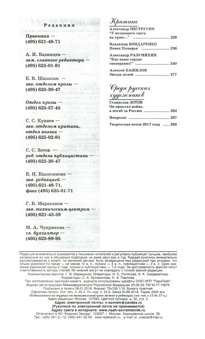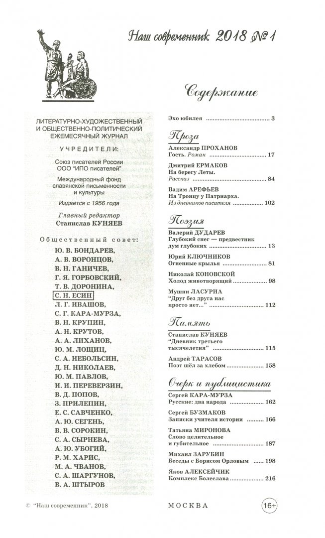 Описание"Наш современник" - журнал писателей России. Издается в Москве с 1956 года. Главный редактор - Станислав Куняев.Основные направления: современная проза и патриотическая публицистика. Наиболее значительные достижения "Нашего современника" связаны с так называемой "деревенской прозой". С начала 70-х годов в журнале опубликованы произведения Ф. Абрамова, В. Астафьева, В. Белова, С. Залыгина, В. Лихоносова, Е. Носова, В. Распутина, В. Солоухина, В. Шукшина. Высокие традиции прозы "Нашего современника" в 90-е годы продолжают публикации И. Головкиной, В. Личутина, Ю. Лощица, Л. Бородина, В. Крупина, А. Лиханова, А. Сегеня.Со второй половины 80-х годов ведущим жанром журнала становится публицистика. С приходом к власти Б. Ельцина журнал встал в оппозицию к его курсу, считая его прозападным, ведущим к разрушению России и гибели русского народа. Среди наиболее активных выразителей этой точки зрения - ведущие публицисты С. Кара-Мурза, В. Кожинов, М. Лобанов, К. Мяло, И. Шафаревич. Впечатляющей хроникой русской трагедии стал "Дневник современника" А. Казинцева, в котором, начиная с 1991 года, анализируются самые актуальные проблемы национальной жизни."Наш современник" - трибуна виднейших политиков патриотического направления. На его страницах неоднократно публиковались статьи С. Бабурина, С. Глазьева, Г. Зюганова, Н. Кондратенко, Н. Рыжкова, А. Тулеева. Особое значение для формирования мировоззренческой позиции журнала имело сотрудничество с митрополитом Иоанном, в частности, публикация его фундаментального труда "Торжество православия".Отличительная особенность журнала "Наш современник" - широчайший охват жизни современной России. Во многом это достигается за счет активного привлечения писателей из провинции. Примерно половина материалов каждого номера создана в глубинной, коренной России.Активная патриотическая позиция журнала обеспечивает ему читательскую поддержку. Последние годы "Наш современник" лидирует по числу индивидуальных подписчиков.Свернуть"Наш современник" - журнал писателей России. Издается в Москве с 1956 года. Главный редактор - Станислав Куняев.Основные направления: современная проза и патриотическая публицистика. Наиболее значительные достижения "Нашего современника" связаны с так называемой "деревенской прозой". С начала 70-х годов в журнале опубликованы произведения Ф. Абрамова, В. Астафьева, В. Белова, С. Залыгина, В. Лихоносова, Е. Носова, В. Распутина, В. Солоухина, В. Шукшина. Высокие традиции прозы "Нашего современника" в 90-е годы продолжают публикации И. Головкиной, В. Личутина, Ю. Лощица, Л. Бородина, В. Крупина, А. Лиханова, А. Сегеня.Со второй половины 80-х годов ведущим жанром журнала становится публицистика. С приходом к власти Б. Ельцина журнал встал в оппозицию к его курсу, считая его прозападным, ведущим к разрушению России и гибели русского народа. Среди наиболее активных выразителей этой точки зрения - ведущие публицисты С. Кара-Мурза, В. Кожинов, М. Лобанов, К. Мяло, И. Шафаревич. Впечатляющей хроникой русской трагедии стал "Дневник современника" А. Казинцева, в котором, начиная с 1991 года, анализируются самые актуальные проблемы национальной жизни."Наш современник" - трибуна виднейших политиков патриотического направления. На его страницах неоднократно публиковались статьи С. Бабурина, С. Глазьева, Г. Зюганова, Н. Кондратенко