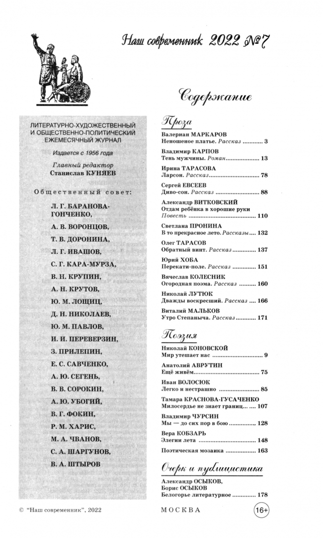 ОписаниеЖурнал «Наш современник» основан в 1956 году. Его ведущими авторами были Валентин Распутин, Василий Белов, Василий Шукшин, Вадим Кожинов, Виктор Астафьев, Гавриил Троепольский, Валентин Пикуль, Игорь Шафаревич и многие другие известнейшие писатели и публицисты России. Вот уже более четверти века журнал возглавляет Станислав Юрьевич Куняев. Ныне в журнале работают и постоянно публикуются Александр Казинцев, Сергей Куняев, Александр Сегень, Евгений Шишкин, Станислав Зотов. Авторами журнала сейчас являются Захар Прилепин, Роман Сенчин, Сергей Шаргунов, Александр Проханов, Михаил Тарковский, Валерий Ганичев, Владимир Бушин, Андрей Фурсов и многие другие известные современные писатели и публицисты. Журнал неизменно уделяет внимание творчеству молодых авторов.Проза журнала «Наш современник» постоянно на передовой, постоянно в борьбе, неутомимо отражает атаки со стороны меняющейся, и далеко не всегда в лучшую сторону, действительности. Рассказывают ли авторы о далёких временах нашей истории, о недавних событиях, на которые чрезмерно богат был век ХХ, или же ведут честный разговор о сегодняшнем дне, всё это всегда звучит современно и своевременно. В центре повествования рассказов, повестей, новелл и романов — русский человек во всех его проявлениях, как героических, так и неприглядных, как светлых, так и тёмных. Со страниц прозы журнал привык говорить истину как «царям», так и народу. И на смену уходящим старшим поколениям приходят молодые — будущие Беловы и Распутины, Шолоховы и Шукшины, Носовы и Прохановы. Те, кто смело выходит в бурное море нынешней литературной жизни России и мира.Публицистика журнала «Наш современник» всегда отличалась своей боевитостью и актуальностью, вскрытием самых серьёзных проблем современного мира, глубоким анализом исторических процессов, философскими обобщениями. Журнал стоит на русской национальной почве, и с помощью самобытного взгляда на мир раскрывает и анализирует сложные процессы, идущие в обществе. Не сглаживать проблемы, а пытаться со всей ответственностью говорить на самые острые темы, поднимать самые острые вопросы — вот кредо журнала. Именно такая публицистика и снискала себе заслуженную признательность и интерес читательской аудитории.Вот уже более четверти века отдел публицистики журнала возглавляет аналитик и политолог, автор многих проблемных книг и статей Александр Иванович Казинцев. Благодаря, во многом, его усилиям, журнал «Наш современник» стал особо дорог читателям своей бескомпромиссной и ясной идейной позицией, направленной, прежде всего, на защиту русских национальных интересов.СвернутьЖурнал «Наш современник» основан в 1956 году. Его ведущими авторами были Валентин Распутин, Василий Белов, Василий Шукшин, Вадим Кожинов, Виктор Астафьев, Гавриил Троепольский, Валентин Пикуль, Игорь Шафаревич и многие другие известнейшие писатели и публицисты России. Вот уже более четверти века журнал возглавляет Станислав Юрьевич Куняев. Ныне в журнале работают и постоянно публикуются Александр Казинцев, Сергей Куняев, Александр Сегень, Евгений Шишкин, Станислав Зотов. Авторами журнала сейчас являются Захар Прилепин, Роман Сенчин, Сергей Шаргунов, Александр Проханов, Михаил Тарковский, Валерий Ганичев, Владимир Бушин, Андрей Фурсов и многие другие известные современ