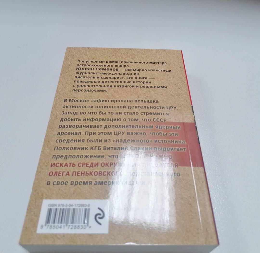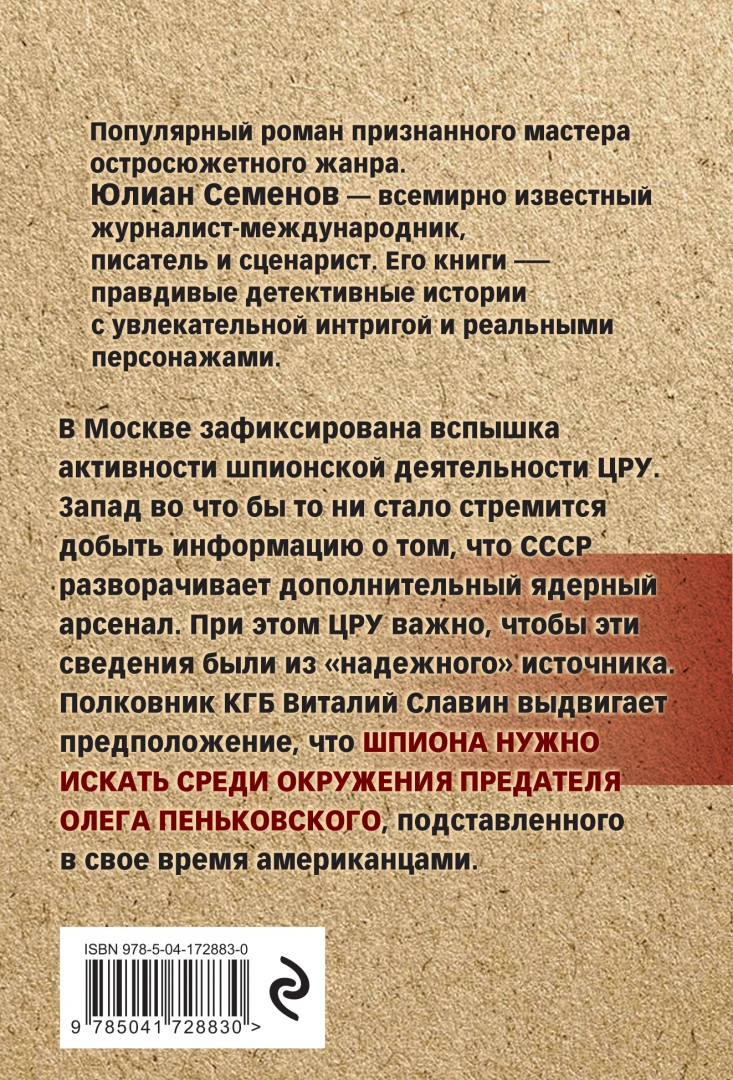 ОписаниеПопулярный роман признанного мастера остросюжетного жанра. Юлиан Семенов - всемирно известный журналист-международник, писатель и сценарист. Его книги - правдивые детективные истории с увлекательной интригой и реальными персонажами. Их экранизации вошли в "золотой фонд" советского кино. В Москве зафиксирована вспышка активности шпионской деятельности ЦРУ. Запад во что бы то ни стало стремится добыть информацию о том, что СССР разворачивает дополнительный ядерный арсенал. При этом ЦРУ важно, чтобы эти сведения были из "надежного" источника. Полковник КГБ Виталий Славин выдвигает предположение, что шпиона нужно искать среди окружения предателя Олега Пеньковского, подставленного в свое время американцами. Романы автора переведены на многие языки и на протяжении десятилетий регулярно издаются в разных странах большими тиражами.Популярный роман признанного мастера остросюжетного жанра. Юлиан Семенов - всемирно известный журналист-международник, писатель и сценарист. Его книги - правдивые детективные истории с увлекательной интригой и реальными персонажами. Их экранизации вошли в "золотой фонд" советского кино. В Москве зафиксирована вспышка активности шпионской деятельности ЦРУ. Запад во что бы то ни стало стремится добыть информацию о том, что СССР разворачивает дополнительный ядерный арсенал. При этом ЦРУ важно, чтобы эти сведения были из "надежного" источника. Полковник КГБ Виталий Славин выдвигает предположение, что шпиона нужно искать среди окружения предателя Олега Пеньковского, подставленного в свое время американцами. Романы автора переведены на многие языки и на протяжении десятилетий регулярно издаются в разных странах большими тиражами.