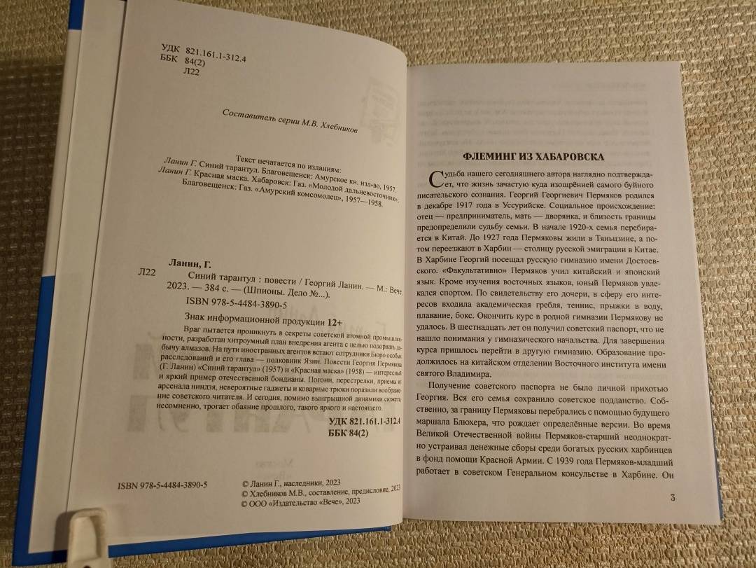 ОписаниеВраг пытается проникнуть в секреты советской атомной промышленности, разработан хитроумный план внедрения агента с целью подорвать добычу алмазов. На пути иностранных агентов встают сотрудники Бюро особых расследований и его глава - полковник Язин. Повести Георгия Пермякова (Г. Ланин) "Синий тарантул" (1957) и "Красная маска" (1958) - интересный и яркий пример отечественной бондианы. Погони, перестрелки, приемы из арсенала ниндзя, невероятные гаджеты и коварные трюки поразили воображение советского читателя. И сегодня, помимо выигрышной динамики сюжета, несомненно, трогает обаяние прошлого, такого яркого и настоящего.Враг пытается проникнуть в секреты советской атомной промышленности, разработан хитроумный план внедрения агента с целью подорвать добычу алмазов. На пути иностранных агентов встают сотрудники Бюро особых расследований и его глава - полковник Язин. Повести Георгия Пермякова (Г. Ланин) "Синий тарантул" (1957) и "Красная маска" (1958) - интересный и яркий пример отечественной бондианы. Погони, перестрелки, приемы из арсенала ниндзя, невероятные гаджеты и коварные трюки поразили воображение советского читателя. И сегодня, помимо выигрышной динамики сюжета, несомненно, трогает обаяние прошлого, такого яркого и настоящего.