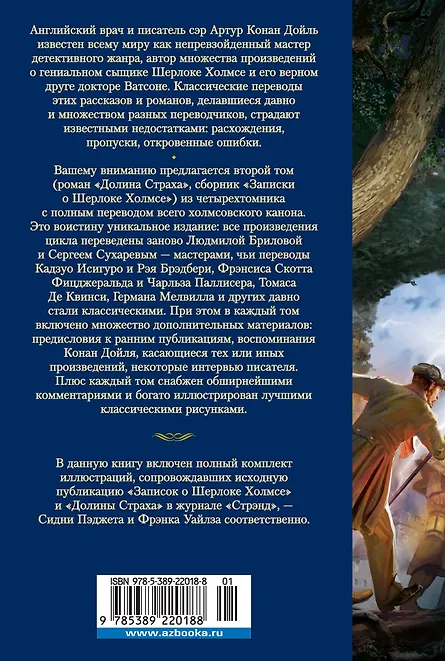 ОписаниеАнглийский врач и писатель сэр Артур Конан Дойль известен всему миру как непревзойденный мастер детективного жанра, автор множества произведений о гениальном сыщике Шерлоке Холмсе и его верном друге докторе Ватсоне. Классические переводы этих рассказов и романов, делавшиеся давно и множеством разных переводчиков, страдают известными недостатками: расхождения, пропуски, откровенные ошибки. Вашему вниманию предлагается второй том (роман "Долина Страха", сборник "Записки о Шерлоке Холмсе") из четырехтомника с полным переводом всего холмсовского канона. Это воистину уникальное издание: все произведения цикла переведены заново Людмилой Бриловой и Сергеем Сухаревым - мастерами, чьи переводы Кадзуо Исигуро и Рэя Брэдбери, Фрэнсиса Скотта Фицджеральда и Чарльза Паллисера, Томаса Де Квинси, Германа Мелвилла и других давно стали классическими. При этом в каждый том включено множество дополнительных материалов: предисловия к ранним публикациям, воспоминания Конан Дойля, касающиеся тех или иных произведений, некоторые интервью писателя. Плюс каждый том снабжен обширнейшими комментариями и богато иллюстрирован лучшими классическими рисунками. В данную книгу включен полный комплект иллюстраций, сопровождавших исходную публикацию "Записок о Шерлоке Холмсе" и "Долины Страха" в журнале "Стрэнд", - Сидни Пэджета и Фрэнка Уайлза соответственно.СвернутьАнглийский врач и писатель сэр Артур Конан Дойль известен всему миру как непревзойденный мастер детективного жанра, автор множества произведений о гениальном сыщике Шерлоке Холмсе и его верном друге докторе Ватсоне. Классические переводы этих рассказов и романов, делавшиеся давно и множеством разных переводчиков, страдают известными недостатками: расхождения, пропуски, откровенные ошибки. Вашему вниманию предлагается второй том (роман "Долина Страха", сборник "Записки о Шерлоке Холмсе") из четырехтомника с полным переводом всего холмсовского канона. Это воистину уникальное издание: все произведения цикла переведены заново Людмилой Бриловой и Сергеем Сухаревым - мастерами, чьи переводы Кадзуо Исигуро и Рэя Брэдбери, Фрэнсиса Скотта Фицджеральда и Чарльза Паллисера, Томаса Де Квинси, Германа Мелвилла и других давно стали классическими. При этом в каждый том включено множество дополнительных материалов: предисловия к ранним публикациям, воспоминания Конан Дойля, касающиеся тех или иных произведений, некоторые интервью писателя. Плюс каждый том снабжен обширнейшими комментариями и богато иллюстрирован лучшими классическими рисунками. В данную книгу включен полный комплект иллюстраций, сопровождавших исходную публикацию "Записок о Шерлоке Холмсе" и "Долины Страха" в журнале "Стрэнд", - Сидни Пэджета и Фрэнка Уайлза соответственно.СвернутьСвернуть