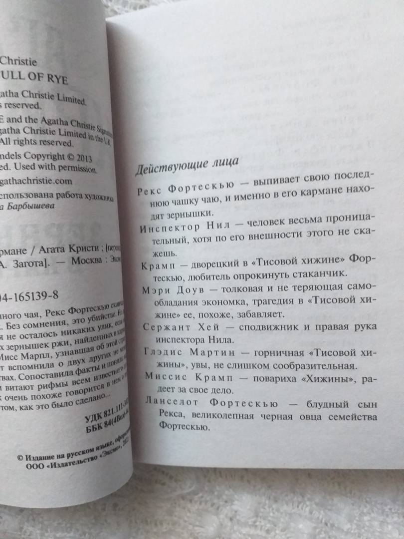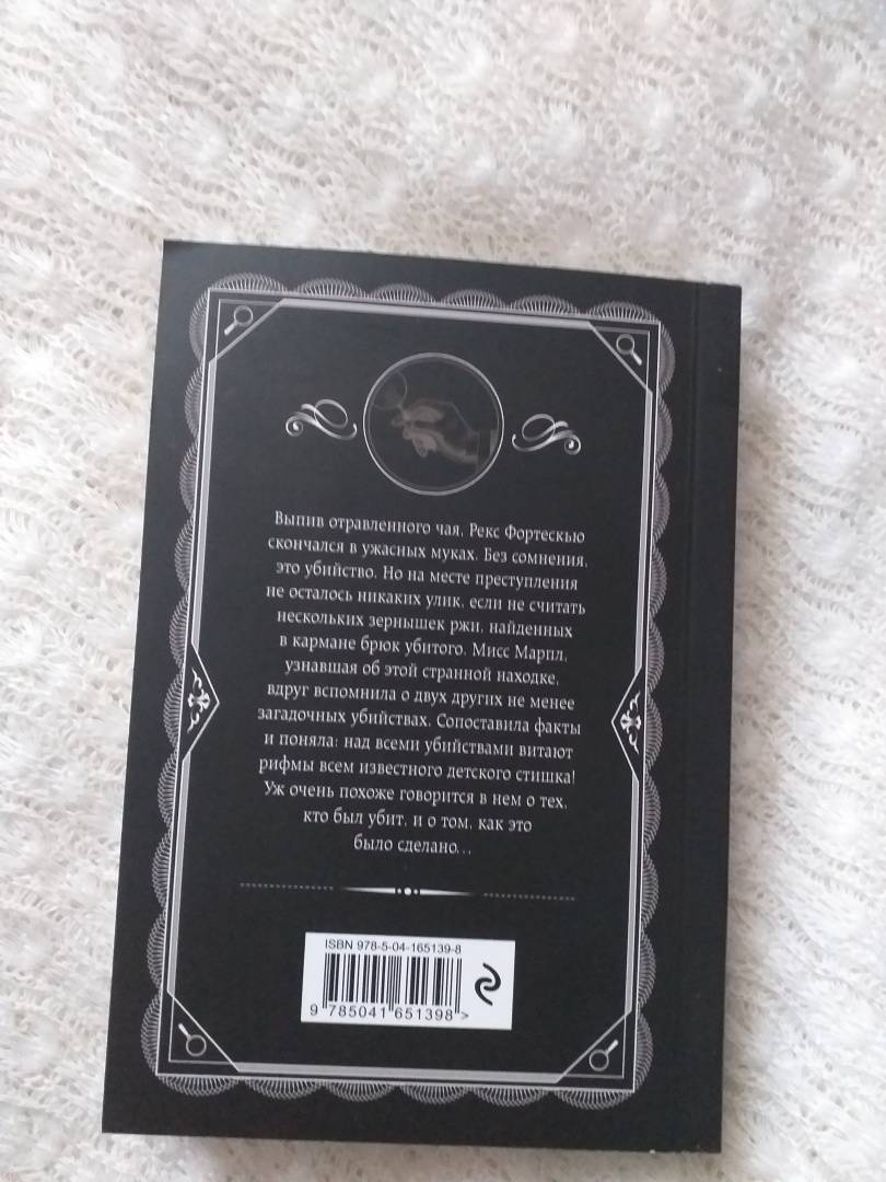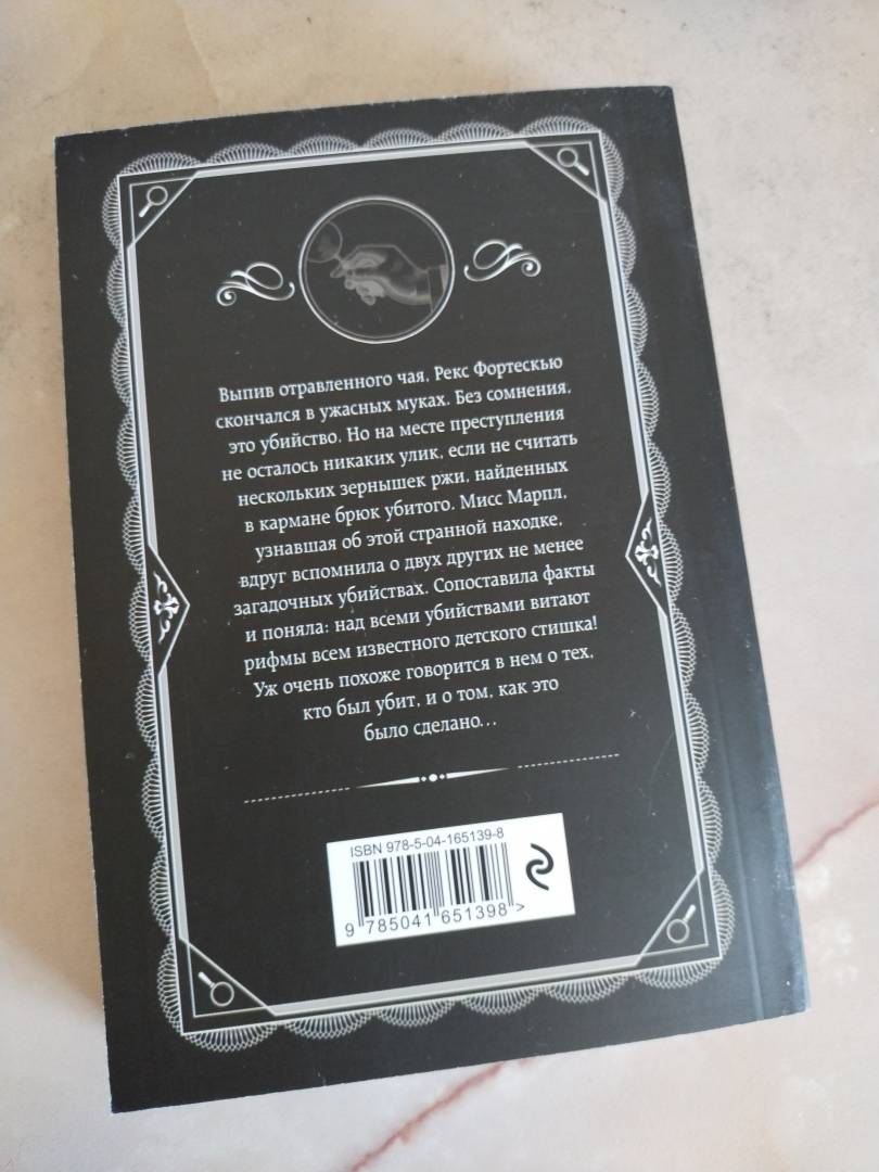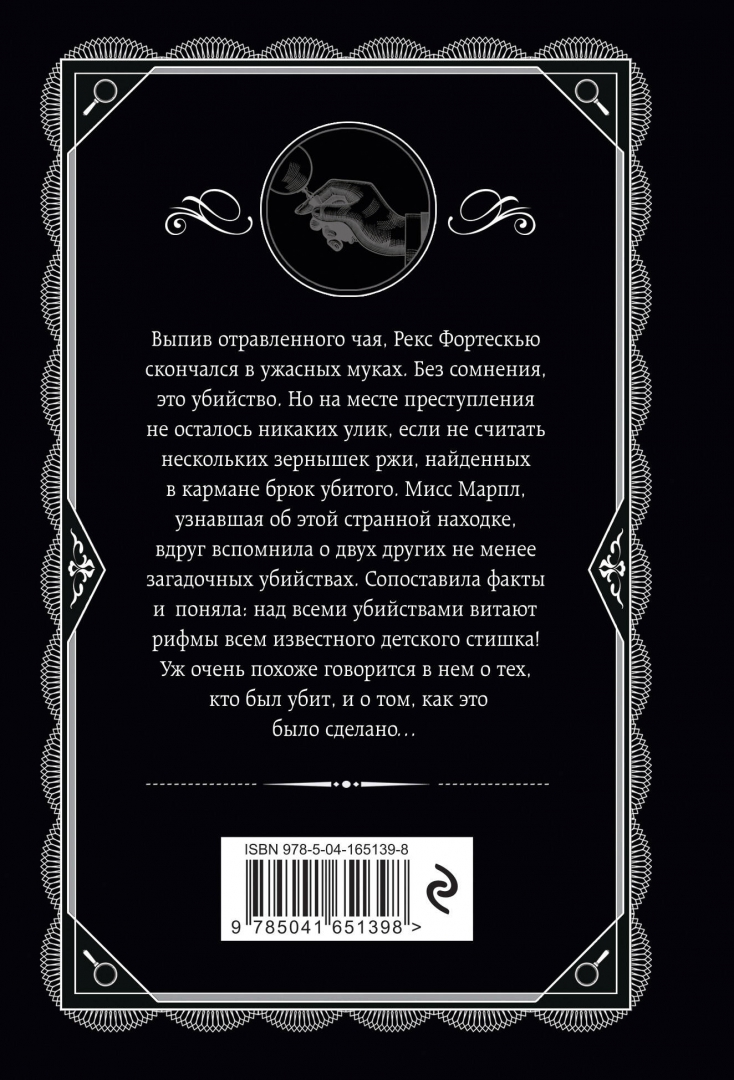 ОписаниеВыпив отравленного чая, Рекс Фортескью скончался в ужасных муках. Без сомнения, это убийство. Но на месте преступления не осталось никаких улик, если не считать нескольких зернышек ржи, найденных в кармане брюк убитого. Мисс Марпл, узнавшая об этой странной находке, вдруг вспомнила о двух других не менее загадочных убийствах. Сопоставила факты и поняла: над всеми убийствами витают рифмы всем известного детского стишка! Уж очень похоже говорится в нем о тех, кто был убит, и о том, как это было сделано…Выпив отравленного чая, Рекс Фортескью скончался в ужасных муках. Без сомнения, это убийство. Но на месте преступления не осталось никаких улик, если не считать нескольких зернышек ржи, найденных в кармане брюк убитого. Мисс Марпл, узнавшая об этой странной находке, вдруг вспомнила о двух других не менее загадочных убийствах. Сопоставила факты и поняла: над всеми убийствами витают рифмы всем известного детского стишка! Уж очень похоже говорится в нем о тех, кто был убит, и о том, как это было сделано…