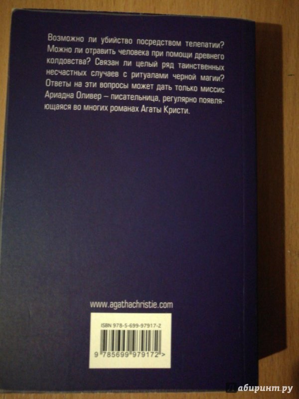 ОписаниеВозможно ли убийство посредством телепатии? Можно ли отравить человека при помощи древнего колдовства? Связан ли целый ряд таинственных несчастных случаев с ритуалами черной магии? Ответы на эти вопросы может дать только миссис Ариадна Оливер - писательница, регулярно появляющаяся во многих романах Агаты Кристи.Возможно ли убийство посредством телепатии? Можно ли отравить человека при помощи древнего колдовства? Связан ли целый ряд таинственных несчастных случаев с ритуалами черной магии? Ответы на эти вопросы может дать только миссис Ариадна Оливер - писательница, регулярно появляющаяся во многих романах Агаты Кристи.
