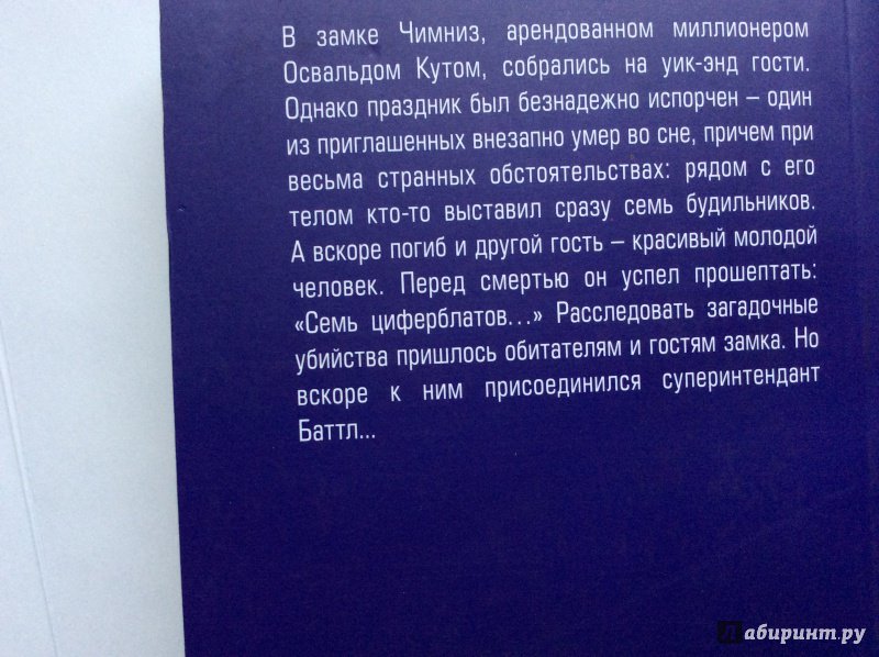 ОписаниеВ замке Чимниз, арендованном миллионером Освальдом Кутом, собрались на уикенд гости. Однако праздник был безнадежно испорчен: один из приглашенных внезапно умер во сне, причем при весьма странных обстоятельствах: рядом с его телом кто-то выставил сразу семь будильников. А вскоре погиб и другой гость - красивый молодой человек. Перед смертью он успел прошептать: "Семь циферблатов…" Расследовать загадочные убийства пришлось обитателям и гостям замка. Но вскоре к ним присоединился суперинтендант Баттл...В замке Чимниз, арендованном миллионером Освальдом Кутом, собрались на уикенд гости. Однако праздник был безнадежно испорчен: один из приглашенных внезапно умер во сне, причем при весьма странных обстоятельствах: рядом с его телом кто-то выставил сразу семь будильников. А вскоре погиб и другой гость - красивый молодой человек. Перед смертью он успел прошептать: "Семь циферблатов…" Расследовать загадочные убийства пришлось обитателям и гостям замка. Но вскоре к ним присоединился суперинтендант Баттл...