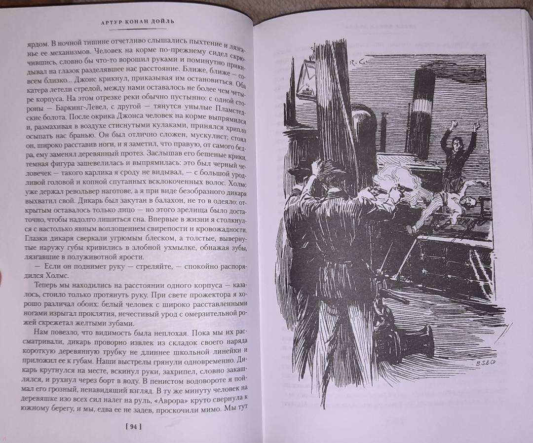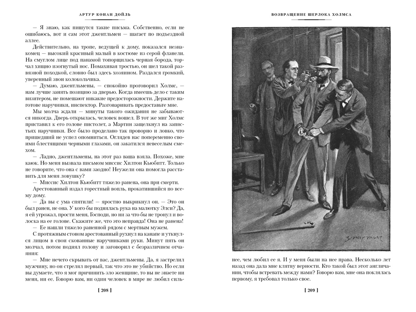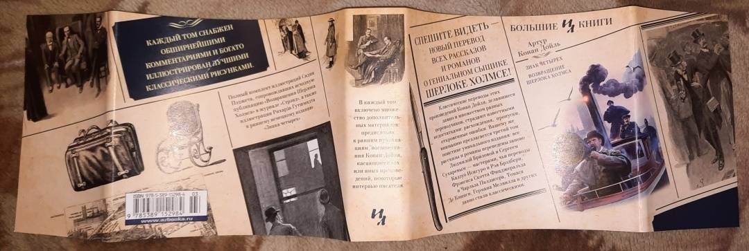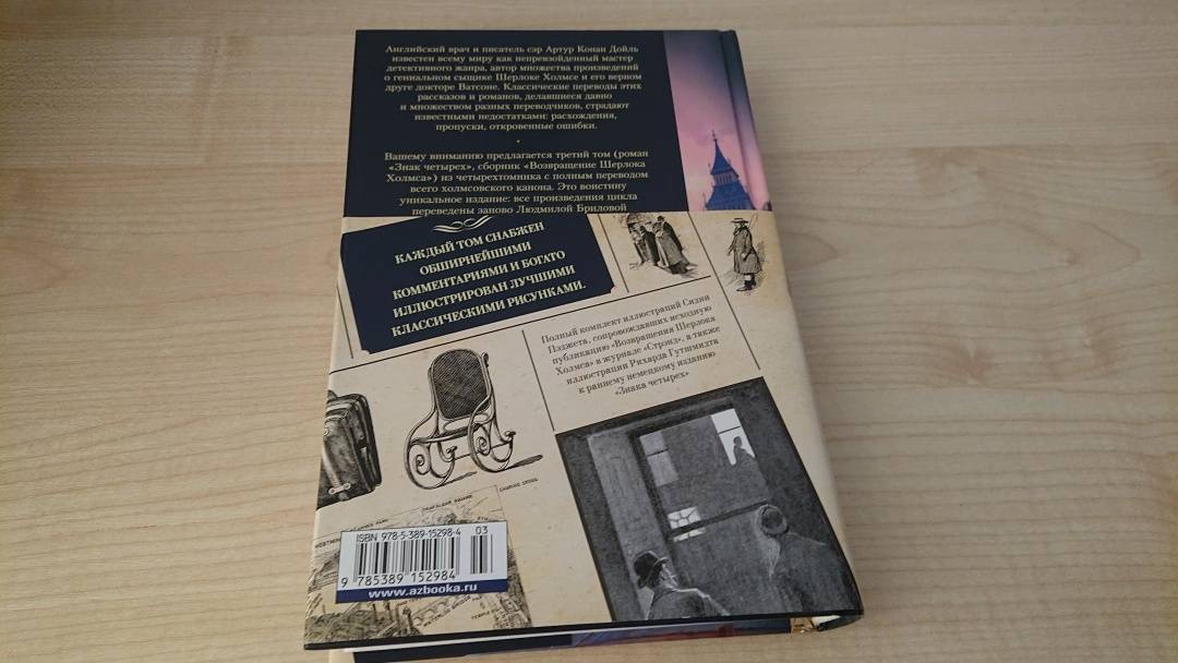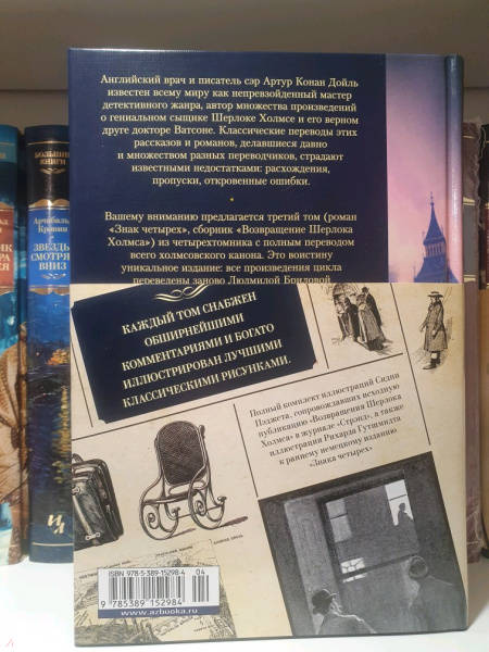 ОписаниеАнглийский врач и писатель сэр Артур Конан Дойль известен всему миру как непревзойденный мастер детективного жанра, автор множества произведений о гениальном сыщике Шерлоке Холмсе и его верном друге докторе Ватсоне. Классические переводы этих рассказов и романов, делавшиеся давно и множеством разных переводчиков, страдают известными недостатками: расхождения, пропуски, откровенные ошибки. Вашему вниманию предлагается третий том (роман "Знак четырех", сборник "Возвращение Шерлока Холмса") из четырехтомника с полным переводом всего холмсовского канона. Это воистину уникальное издание: все произведения цикла переведены заново Людмилой Бриловой и Сергеем Сухаревым - мастерами, чьи переводы Кадзуо Исигуро и Рэя Брэдбери, Фрэнсиса Скотта Фицджеральда и Чарльза Паллисера, Томаса Де Квинси, Германа Мелвилла и других давно стали классическими. При этом в каждый том включено множество дополнительных материалов: предисловия к ранним публикациям, воспоминания Конан Дойля, касающиеся тех или иных произведений, некоторые интервью писателя. Плюс каждый том снабжен обширнейшими комментариями и богато иллюстрирован лучшими классическими рисунками.В данную книгу включен полный комплект иллюстраций Сидни Пэджета, сопровождавших исходную публикацию "Возвращения Шерлока Холмса" в журнале "Стрэнд", а также иллюстрации Рихарда Гутшмидта к раннему немецкому изданию "Знака четырех".СвернутьАнглийский врач и писатель сэр Артур Конан Дойль известен всему миру как непревзойденный мастер детективного жанра, автор множества произведений о гениальном сыщике Шерлоке Холмсе и его верном друге докторе Ватсоне. Классические переводы этих рассказов и романов, делавшиеся давно и множеством разных переводчиков, страдают известными недостатками: расхождения, пропуски, откровенные ошибки. Вашему вниманию предлагается третий том (роман "Знак четырех", сборник "Возвращение Шерлока Холмса") из четырехтомника с полным переводом всего холмсовского канона. Это воистину уникальное издание: все произведения цикла переведены заново Людмилой Бриловой и Сергеем Сухаревым - мастерами, чьи переводы Кадзуо Исигуро и Рэя Брэдбери, Фрэнсиса Скотта Фицджеральда и Чарльза Паллисера, Томаса Де Квинси, Германа Мелвилла и других давно стали классическими. При этом в каждый том включено множество дополнительных материалов: предисловия к ранним публикациям, воспоминания Конан Дойля, касающиеся тех или иных произведений, некоторые интервью писателя. Плюс каждый том снабжен обширнейшими комментариями и богато иллюстрирован лучшими классическими рисунками.В данную книгу включен полный комплект иллюстраций Сидни Пэджета, сопровождавших исходную публикацию "Возвращения Шерлока Холмса" в журнале "Стрэнд", а также иллюстрации Рихарда Гутшмидта к раннему немецкому изданию "Знака четырех".СвернутьСвернуть