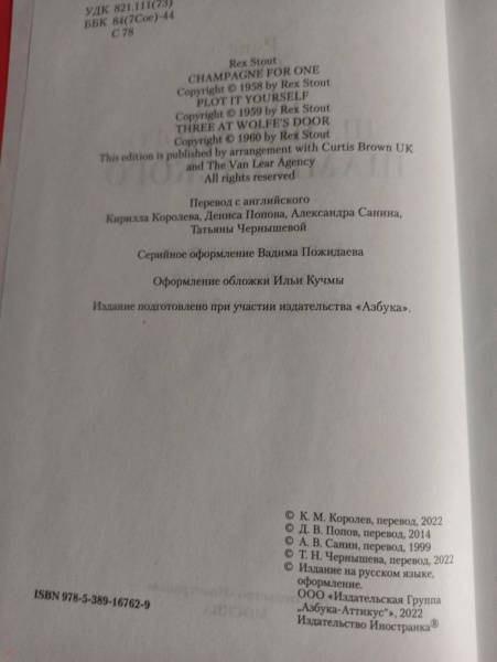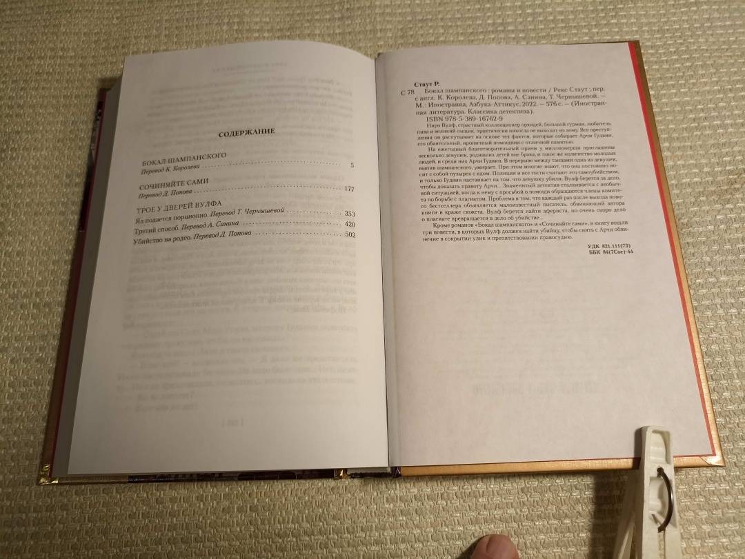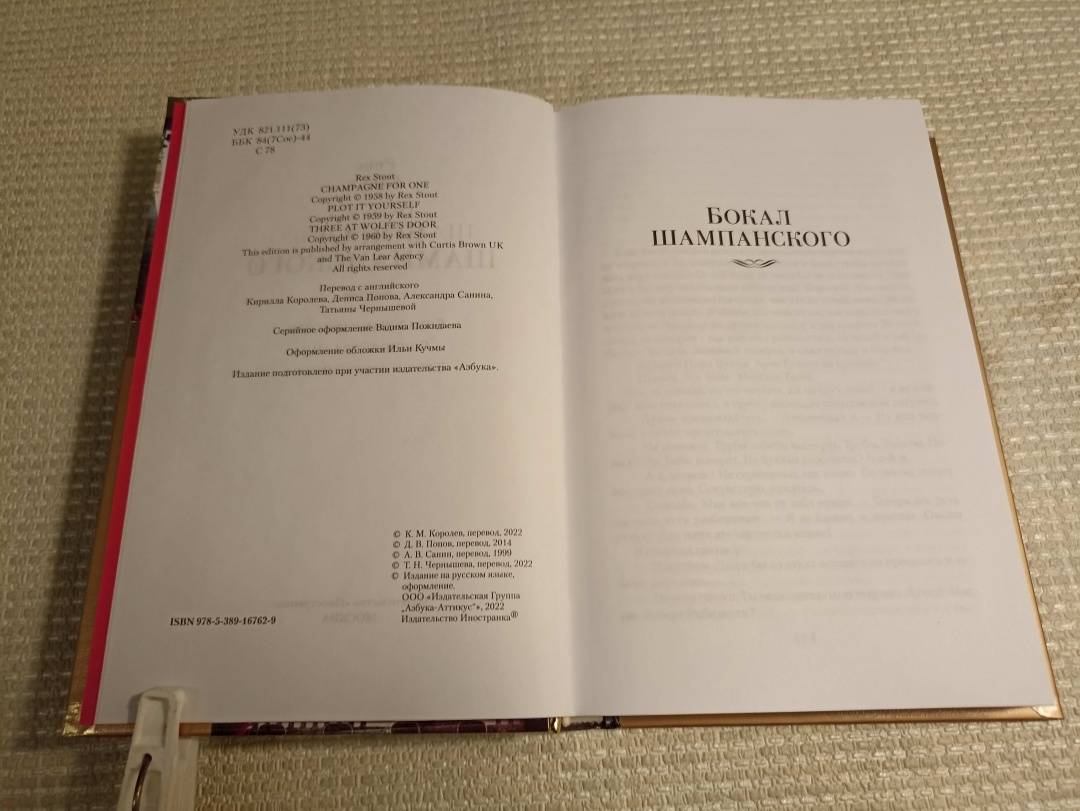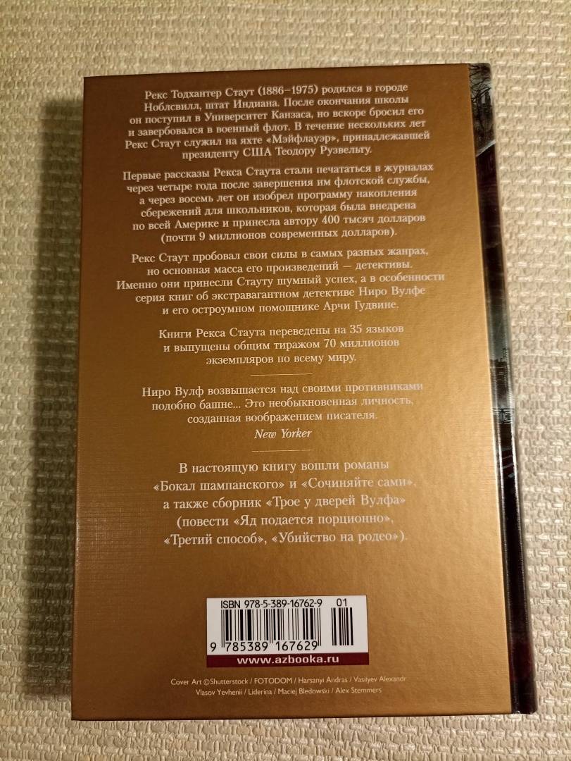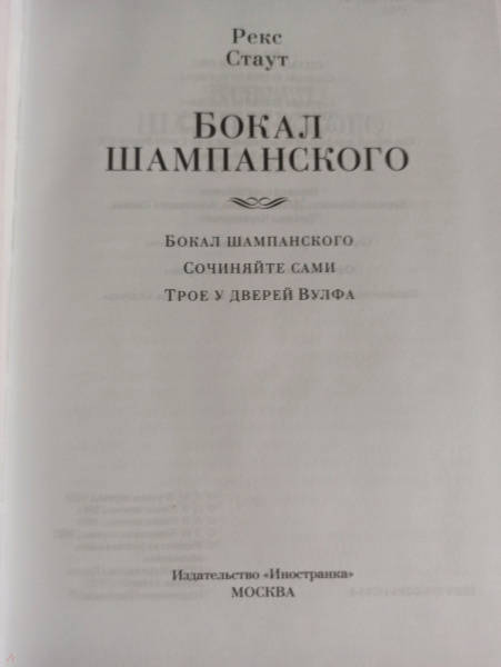 ОписаниеНиро Вулф, страстный коллекционер орхидей, большой гурман, любитель пива и великий сыщик, практически никогда не выходит из дому. Все преступления он распутывает на основе тех фактов, которые собирает Арчи Гудвин, его обаятельный, ироничный помощник с отличной памятью. На ежегодный благотворительный прием у миллионерши приглашены несколько девушек, родивших детей вне брака, и такое же количество молодых людей, и среди них Арчи Гудвин. В перерыве между танцами одна из девушек, выпив шампанского, умирает. При этом многие знают, что она постоянно носит с собой пузырек с ядом. Полиция и все гости считают это самоубийством, и только Гудвин настаивает на том, что девушку убили. Вулф берется за дело, чтобы доказать правоту Арчи… Знаменитый детектив сталкивается с необычной ситуацией, когда к нему с просьбой о помощи обращаются члены комитета по борьбе с плагиатом. Проблема в том, что каждый раз после выхода нового бестселлера объявляется малоизвестный писатель, обвиняющий автора книги в краже сюжета. Вулф берется найти афериста, но очень скоро дело о плагиате превращается в дело об убийстве… Кроме романов «Бокал шампанского» и «Сочиняйте сами», в книгу вошли еще три повести, в которых Вулф должен найти убийцу, чтобы снять с Арчи обвинение в сокрытии улик и препятствовании правосудию.СвернутьНиро Вулф, страстный коллекционер орхидей, большой гурман, любитель пива и великий сыщик, практически никогда не выходит из дому. Все преступления он распутывает на основе тех фактов, которые собирает Арчи Гудвин, его обаятельный, ироничный помощник с отличной памятью. На ежегодный благотворительный прием у миллионерши приглашены несколько девушек, родивших детей вне брака, и такое же количество молодых людей, и среди них Арчи Гудвин. В перерыве между танцами одна из девушек, выпив шампанского, умирает. При этом многие знают, что она постоянно носит с собой пузырек с ядом. Полиция и все гости считают это самоубийством, и только Гудвин настаивает на том, что девушку убили. Вулф берется за дело, чтобы доказать правоту Арчи… Знаменитый детектив сталкивается с необычной ситуацией, когда к нему с просьбой о помощи обращаются члены комитета по борьбе с плагиатом. Проблема в том, что каждый раз после выхода нового бестселлера объявляется малоизвестный писатель, обвиняющий автора книги в краже сюжета. Вулф берется найти афериста, но очень скоро дело о плагиате превращается в дело об убийстве… Кроме романов «Бокал шампанского» и «Сочиняйте сами», в книгу вошли еще три повести, в которых Вулф должен найти убийцу, чтобы снять с Арчи обвинение в сокрытии улик и препятствовании правосудию.СвернутьСвернуть