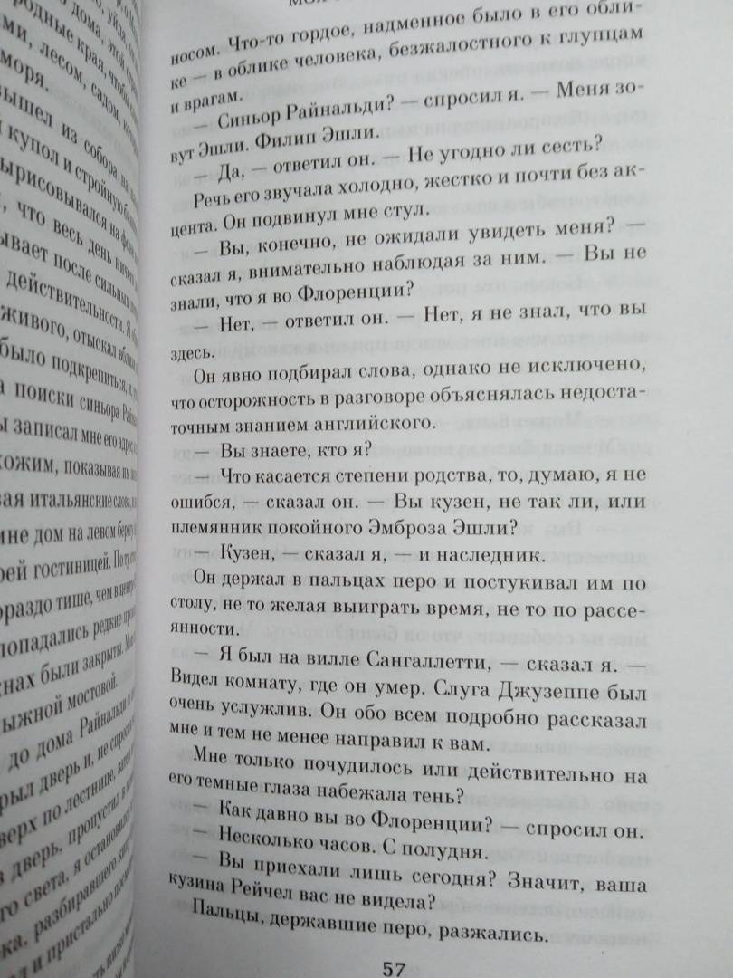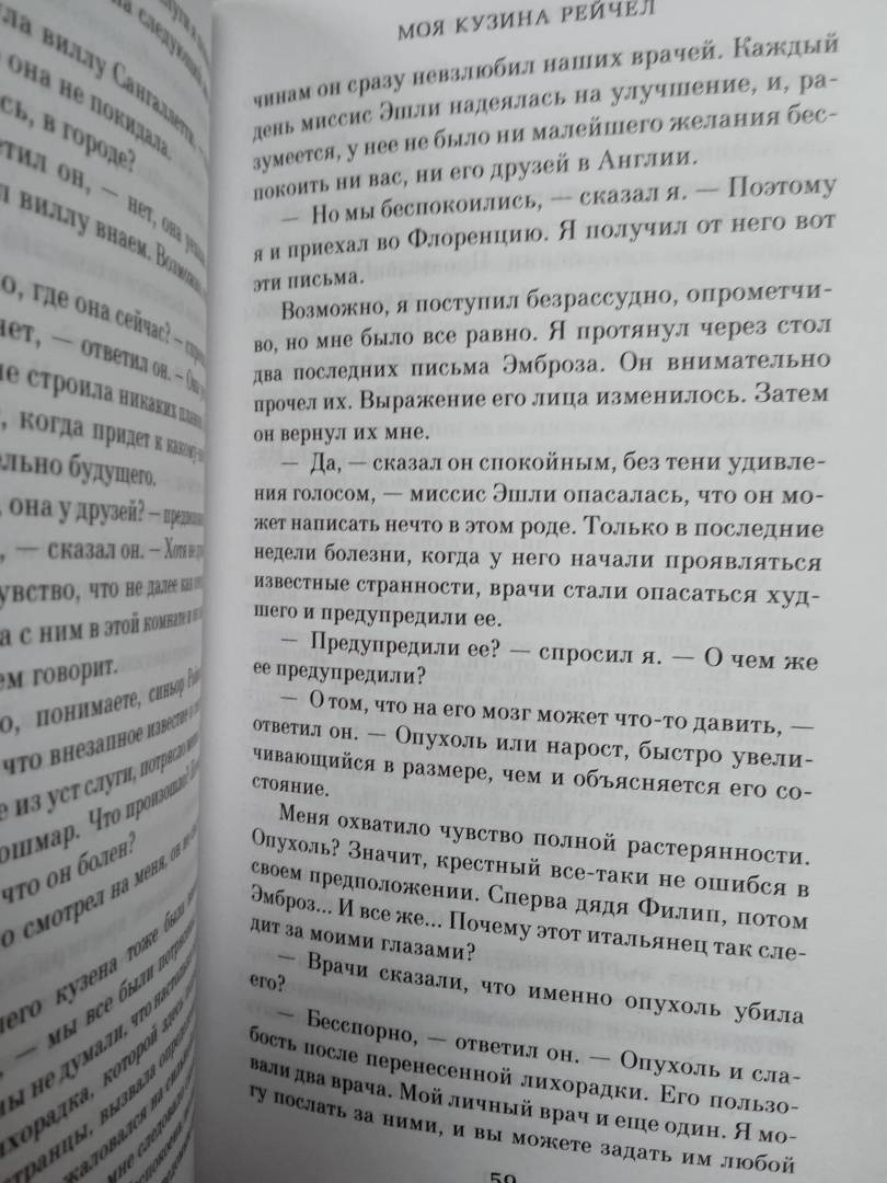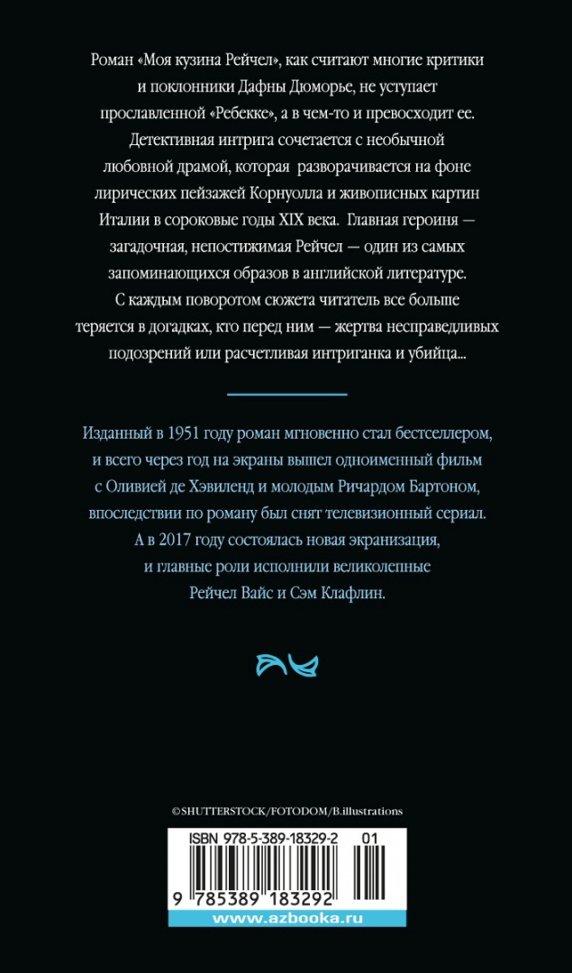 ОписаниеРоман "Моя кузина Рейчел", как считают многие критики и поклонники Дафны Дюморье, не уступает прославленной "Ребекке", а в чем-то и превосходит ее. Детективная интрига сочетается с необычной любовной драмой, которая разворачивается на фоне лирических пейзажей Корнуолла и живописных картин Италии в сороковые годы XIX века. Главная героиня - загадочная, непостижимая Рейчел - один из самых запоминающихся образов в английской литературе. С каждым поворотом сюжета читатель все больше теряется в догадках, кто перед ним - жертва несправедливых подозрений или расчетливая интриганка и убийца… Изданный в 1951 году роман мгновенно стал бестселлером, и всего через год на экраны вышел одноименный фильм с Оливией де Хэвиленд и молодым Ричардом Бартоном, впоследствии по роману был снят телевизионный сериал. А в 2017 году состоялась новая экранизация, и главные роли исполнили великолепные Рейчел Вайс и Сэм Клафлин.Роман "Моя кузина Рейчел", как считают многие критики и поклонники Дафны Дюморье, не уступает прославленной "Ребекке", а в чем-то и превосходит ее. Детективная интрига сочетается с необычной любовной драмой, которая разворачивается на фоне лирических пейзажей Корнуолла и живописных картин Италии в сороковые годы XIX века. Главная героиня - загадочная, непостижимая Рейчел - один из самых запоминающихся образов в английской литературе. С каждым поворотом сюжета читатель все больше теряется в догадках, кто перед ним - жертва несправедливых подозрений или расчетливая интриганка и убийца… Изданный в 1951 году роман мгновенно стал бестселлером, и всего через год на экраны вышел одноименный фильм с Оливией де Хэвиленд и молодым Ричардом Бартоном, впоследствии по роману был снят телевизионный сериал. А в 2017 году состоялась новая экранизация, и главные роли исполнили великолепные Рейчел Вайс и Сэм Клафлин.