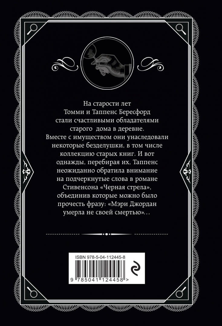 ОписаниеНа старости лет Томми и Таппенс Бересфорды стали счастливыми обладателями старого дома в деревне. Вместе с имуществом они унаследовали некоторые безделушки, в том числе коллекцию старых книг. И вот однажды, перебирая их, Таппенс неожиданно обратила внимание на подчеркнутые слова в романе Стивенсона "Черная стрела", объединив которые, можно было прочесть фразу: "Мэри Джордан умерла не своей смертью"…На старости лет Томми и Таппенс Бересфорды стали счастливыми обладателями старого дома в деревне. Вместе с имуществом они унаследовали некоторые безделушки, в том числе коллекцию старых книг. И вот однажды, перебирая их, Таппенс неожиданно обратила внимание на подчеркнутые слова в романе Стивенсона "Черная стрела", объединив которые, можно было прочесть фразу: "Мэри Джордан умерла не своей смертью"…