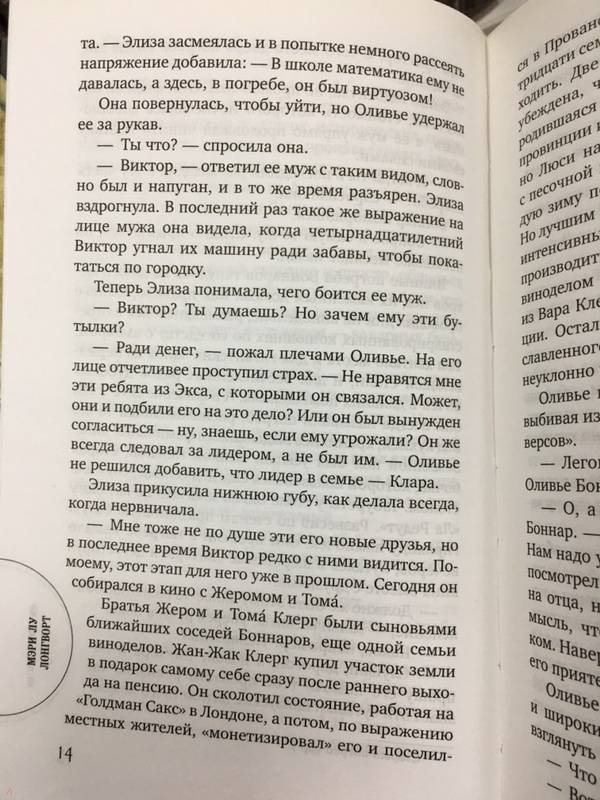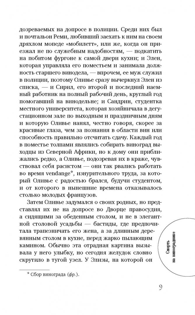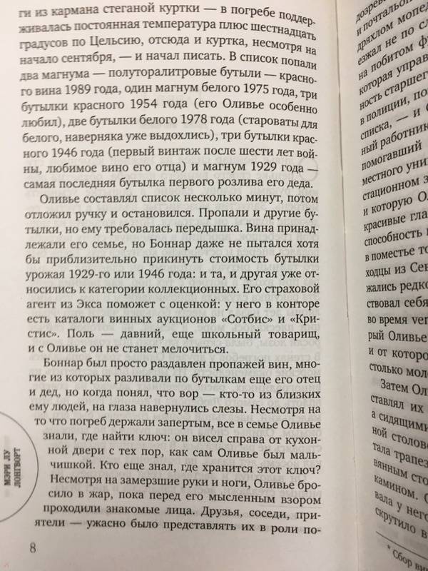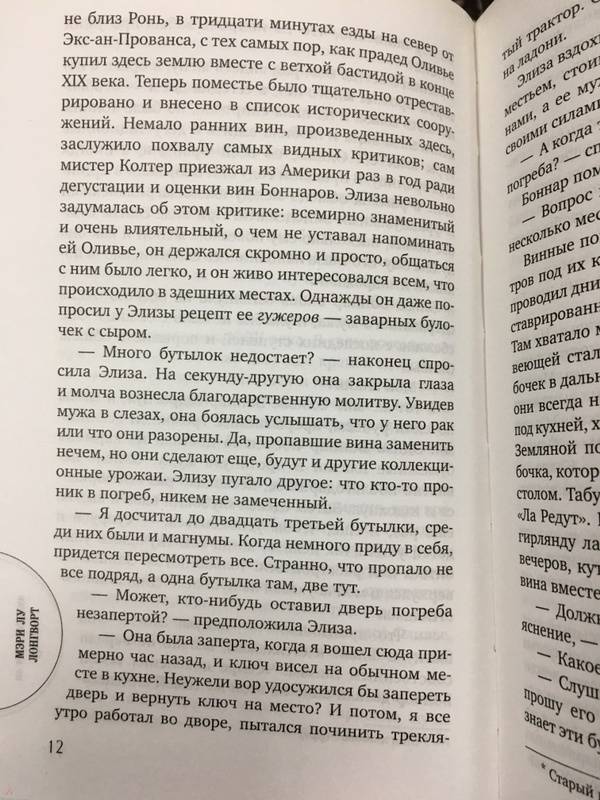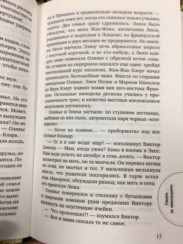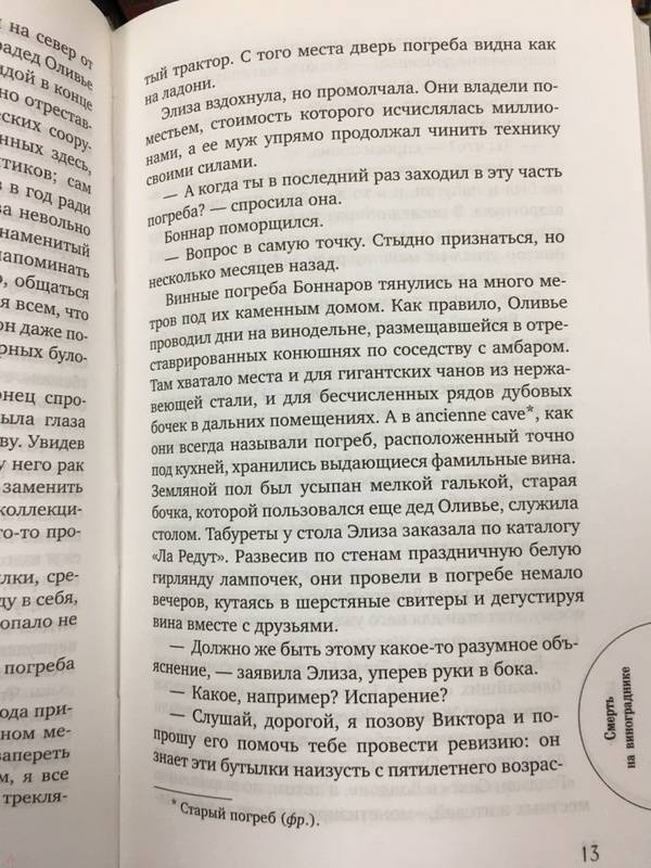 ОписаниеНовое запутанное дело Верлака и Бонне - дело о загадочном убийстве Полин д'Аррас, супруги одного из самых богатых и знатных людей Прованса, чье тело было обнаружено на винограднике, принадлежащем известному виноделу Оливье Боннару.Интересно, что этому преступлению предшествовали два странных происшествия: похищение из погребов Боннара нескольких бутылок раритетных вин и вроде бы ничем не мотивированный нервный срыв мадам д'Аррас, с рыданиями блуждавшей по улицам городка в домашней одежде. Совпадения? Верлак и Бонне уверены: таких совпадений не бывает и эти события как-то связаны с убийством. Но как?..Новое запутанное дело Верлака и Бонне - дело о загадочном убийстве Полин д'Аррас, супруги одного из самых богатых и знатных людей Прованса, чье тело было обнаружено на винограднике, принадлежащем известному виноделу Оливье Боннару.Интересно, что этому преступлению предшествовали два странных происшествия: похищение из погребов Боннара нескольких бутылок раритетных вин и вроде бы ничем не мотивированный нервный срыв мадам д'Аррас, с рыданиями блуждавшей по улицам городка в домашней одежде. Совпадения? Верлак и Бонне уверены: таких совпадений не бывает и эти события как-то связаны с убийством. Но как?..