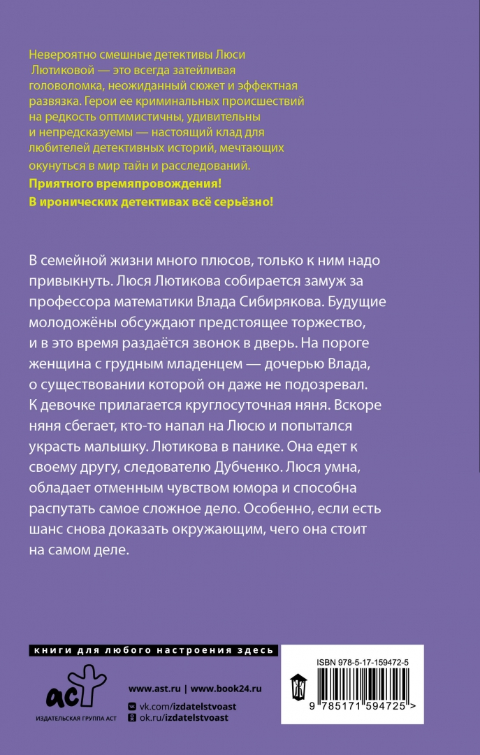 ОписаниеВ семейной жизни много плюсов, только к ним надо привыкнуть.Люся Лютикова собирается замуж за профессора математики Влада Сибирякова. Будущие молодожёны обсуждают предстоящее торжество, и в это время раздаётся звонок в дверь. На пороге женщина с грудным младенцем - дочерью Влада, о существовании которой он даже не подозревал. К девочке прилагается круглосуточная няня. Вскоре няня сбегает, кто-то напал на Люсю и попытался украсть малышку. Лютикова в панике. Она едет к своему другу, следователю Дубченко. Люся умна, обладает отменным чувством юмора и способна распутать самое сложное дело. Особенно, если есть шанс снова доказать окружающим, чего она стоит на самом деле.В семейной жизни много плюсов, только к ним надо привыкнуть.Люся Лютикова собирается замуж за профессора математики Влада Сибирякова. Будущие молодожёны обсуждают предстоящее торжество, и в это время раздаётся звонок в дверь. На пороге женщина с грудным младенцем - дочерью Влада, о существовании которой он даже не подозревал. К девочке прилагается круглосуточная няня. Вскоре няня сбегает, кто-то напал на Люсю и попытался украсть малышку. Лютикова в панике. Она едет к своему другу, следователю Дубченко. Люся умна, обладает отменным чувством юмора и способна распутать самое сложное дело. Особенно, если есть шанс снова доказать окружающим, чего она стоит на самом деле.