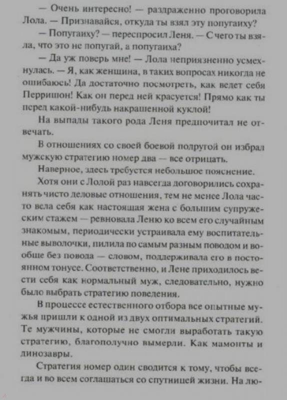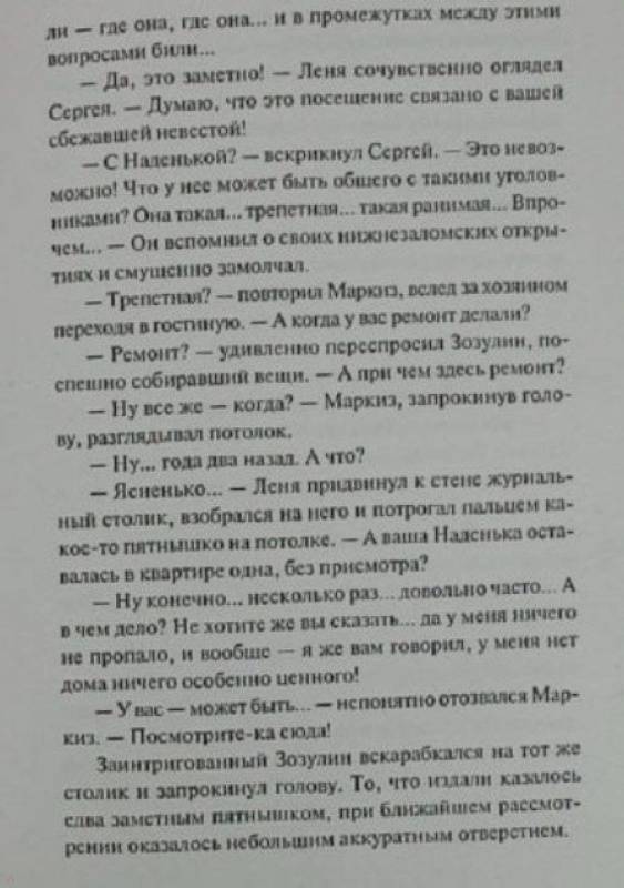 ОписаниеЛучший мошенник всех времен и народов Леня по прозвищу Маркиз и его боевая подруга умница и красавица Лола распутывают очередной клубок тайн и загадок. Некий господин Зозулин просит их отыскать девушку его мечты - тихую и очаровательную Наденьку, которая как сквозь землю провалилась после того, как в ресторане подозрительная брюнетка устроила ей бурный скандал. Но, как известно, нет ничего труднее простых дел!Отправившись на родину Наденьки, в провинциальный город Нижний Залом, господин Зозулин узнает о своей сбежавшей невесте очень странные вещи. А затем Леня буквально натыкается в лифте на труп той самой подозрительной брюнетки... Последняя надежда наших героев - породистая самка экзотического говорящего попугая, самый правдивый и обстоятельный свидетель...Лучший мошенник всех времен и народов Леня по прозвищу Маркиз и его боевая подруга умница и красавица Лола распутывают очередной клубок тайн и загадок. Некий господин Зозулин просит их отыскать девушку его мечты - тихую и очаровательную Наденьку, которая как сквозь землю провалилась после того, как в ресторане подозрительная брюнетка устроила ей бурный скандал. Но, как известно, нет ничего труднее простых дел!Отправившись на родину Наденьки, в провинциальный город Нижний Залом, господин Зозулин узнает о своей сбежавшей невесте очень странные вещи. А затем Леня буквально натыкается в лифте на труп той самой подозрительной брюнетки... Последняя надежда наших героев - породистая самка экзотического говорящего попугая, самый правдивый и обстоятельный свидетель...