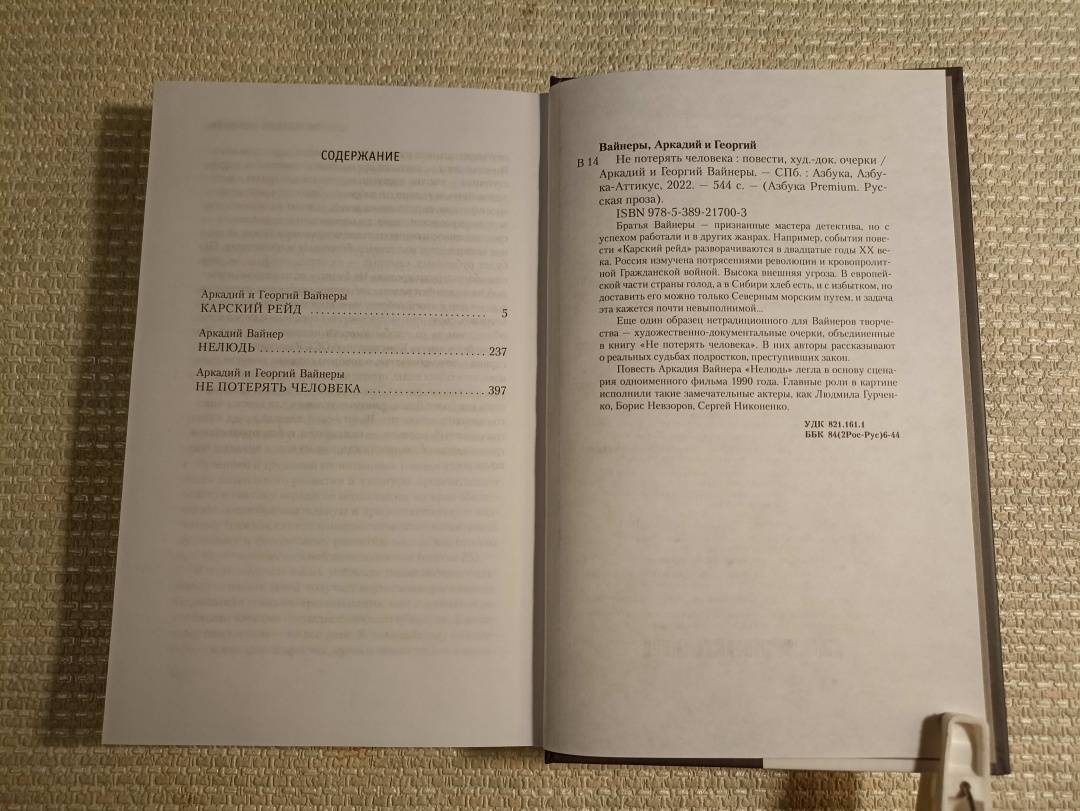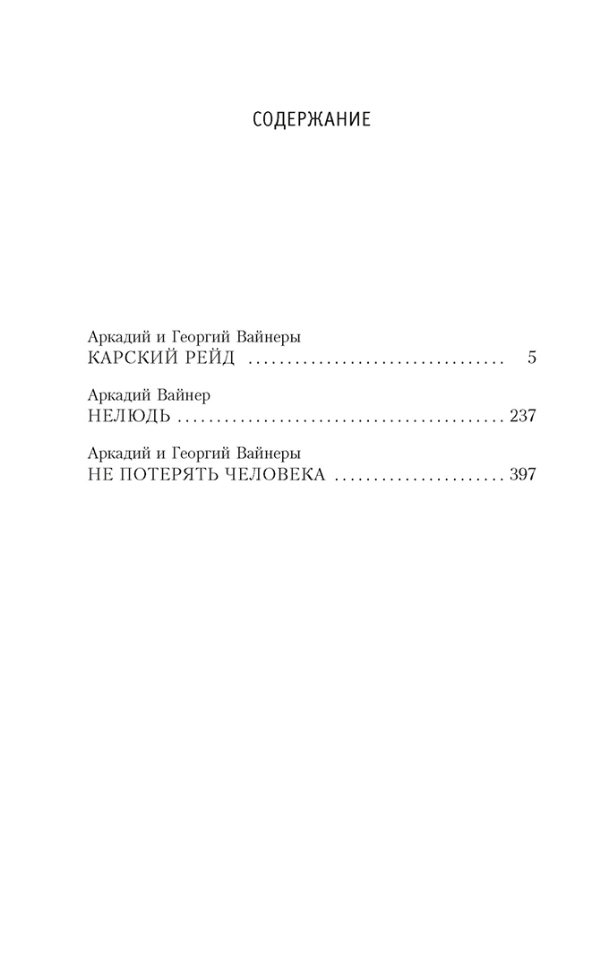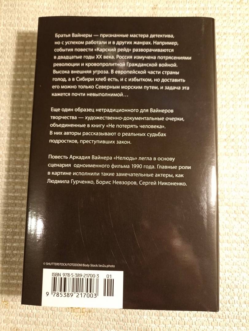ОписаниеБратья Вайнеры — признанные мастера детектива, но с успехом работали и в других жанрах. Например, события повести «Карский рейд» разворачиваются в двадцатые годы XX века. Россия измучена потрясениями революции и кровопролитной Гражданской войной. Высока внешняя угроза. В европейской части страны голод, а в Сибири хлеб есть, и с избытком, но доставить его можно только Северным морским путем, и задача эта кажется почти невыполнимой… Еще один образец нетрадиционного для Вайнеров творчества — художественно-документальные очерки, объединенные в книгу «Не потерять человека». В них авторы рассказывают о реальных судьбах подростков, преступивших закон. Повесть Аркадия Вайнера «Нелюдь» легла в основу сценария одноименного фильма 1990 года. Главные роли в картине исполнили такие замечательные актеры, как Людмила Гурченко, Борис Невзоров, Сергей Никоненко.Братья Вайнеры — признанные мастера детектива, но с успехом работали и в других жанрах. Например, события повести «Карский рейд» разворачиваются в двадцатые годы XX века. Россия измучена потрясениями революции и кровопролитной Гражданской войной. Высока внешняя угроза. В европейской части страны голод, а в Сибири хлеб есть, и с избытком, но доставить его можно только Северным морским путем, и задача эта кажется почти невыполнимой… Еще один образец нетрадиционного для Вайнеров творчества — художественно-документальные очерки, объединенные в книгу «Не потерять человека». В них авторы рассказывают о реальных судьбах подростков, преступивших закон. Повесть Аркадия Вайнера «Нелюдь» легла в основу сценария одноименного фильма 1990 года. Главные роли в картине исполнили такие замечательные актеры, как Людмила Гурченко, Борис Невзоров, Сергей Никоненко.