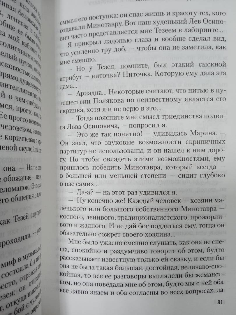 Описание...У известного музыканта, народного артиста СССР Полякова похищена уникальная скрипка работы Страдивари. Такова завязка романа "Визит к Минотавру" (1972), толчком к написанию которого послужила реальная история ограбления квартиры выдающегося советского скрипача Давида Ойстраха. Классический детектив? Не совсем. Роман захватывает и держит в напряжении, как и положено детективу, но вместе с тем многослоен и объединяет два временных пласта. Параллельно с рассказом о расследовании, которое ведет старший инспектор МУРа Тихонов, мы узнаём о великом мастере Страдивари и его учителе Амати, творивших в XVII-XVIII веках в Кремоне. История раскрытия громкого преступления становится поводом для размышлений о "сальерианстве", природе таланта, человеческих пороках и страстях, о Минотавре, живущем в каждом из нас. Умело выстроенная композиция, яркие жанровые зарисовки, живые диалоги, динамичная смена эпизодов и общая кинематографичность... Недаром роман лег в основу популярного телевизионного фильма (1987).Свернуть...У известного музыканта, народного артиста СССР Полякова похищена уникальная скрипка работы Страдивари. Такова завязка романа "Визит к Минотавру" (1972), толчком к написанию которого послужила реальная история ограбления квартиры выдающегося советского скрипача Давида Ойстраха. Классический детектив? Не совсем. Роман захватывает и держит в напряжении, как и положено детективу, но вместе с тем многослоен и объединяет два временных пласта. Параллельно с рассказом о расследовании, которое ведет старший инспектор МУРа Тихонов, мы узнаём о великом мастере Страдивари и его учителе Амати, творивших в XVII-XVIII веках в Кремоне. История раскрытия громкого преступления становится поводом для размышлений о "сальерианстве", природе таланта, человеческих пороках и страстях, о Минотавре, живущем в каждом из нас. Умело выстроенная композиция, яркие жанровые зарисовки, живые диалоги, динамичная смена эпизодов и общая кинематографичность... Недаром роман лег в основу популярного телевизионного фильма (1987).СвернутьСвернуть