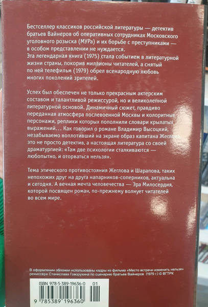 ОписаниеРоман классиков советского детектива братьев Вайнеров об оперативных сотрудниках Московского уголовного розыска (МУРа) и их борьбе с уголовными элементами в особом представлении не нуждается. Эта легендарная книга (1975) стала событием в жизни писателей, а снятый по ней телефильм (1979) обрел всенародную любовь. Успех был обеспечен не только прекрасным актерским составом и талантливой режиссурой, но и литературной основой. Как говорил о романе Владимир Высоцкий, незабываемо воплотивший на экране образ капитана Жеглова, это не просто детектив, а настоящая литература со своей драматургией: «Там две психологии сталкиваются — любопытно, и оторваться нельзя». Динамичный сюжет, правдиво переданная атмосфера послевоенной Москвы и колоритные персонажи, реплики которых пополнили словари крылатых выражений... А тема этического противостояния Жеглова и Шарапова, таких непохожих друг на друга напарников-соперников, не утратила актуальности и сегодня.Роман классиков советского детектива братьев Вайнеров об оперативных сотрудниках Московского уголовного розыска (МУРа) и их борьбе с уголовными элементами в особом представлении не нуждается. Эта легендарная книга (1975) стала событием в жизни писателей, а снятый по ней телефильм (1979) обрел всенародную любовь. Успех был обеспечен не только прекрасным актерским составом и талантливой режиссурой, но и литературной основой. Как говорил о романе Владимир Высоцкий, незабываемо воплотивший на экране образ капитана Жеглова, это не просто детектив, а настоящая литература со своей драматургией: «Там две психологии сталкиваются — любопытно, и оторваться нельзя». Динамичный сюжет, правдиво переданная атмосфера послевоенной Москвы и колоритные персонажи, реплики которых пополнили словари крылатых выражений... А тема этического противостояния Жеглова и Шарапова, таких непохожих друг на друга напарников-соперников, не утратила актуальности и сегодня.