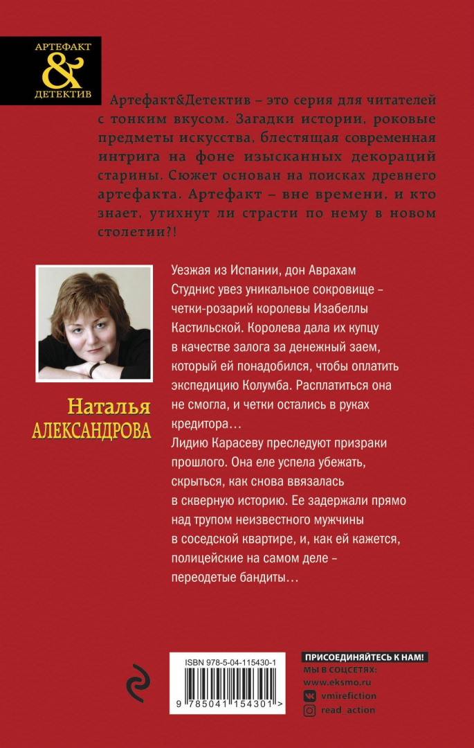 Уезжая из Испании, дон Аврахам Студнис увез уникальное сокровище – четки-розарий королевы Изабеллы Кастильской. Королева дала их купцу в качестве залога за денежный заем, который ей понадобился, чтобы оплатить экспедицию Колумба. Расплатиться она не смогла, и четки остались в руках кредитора… Лидию Карасеву преследуют призраки прошлого. Она еле успела убежать, скрыться, как снова ввязалась в скверную историю. Ее задержали прямо над трупом неизвестного мужчины в соседской квартире, и, как ей кажется, полицейские на самом деле – переодетые бандиты…Артефакт&Детектив – это серия для читателей с тонким вкусом. Загадки истории, роковые предметы искусства, блестящая современная интрига на фоне изысканных