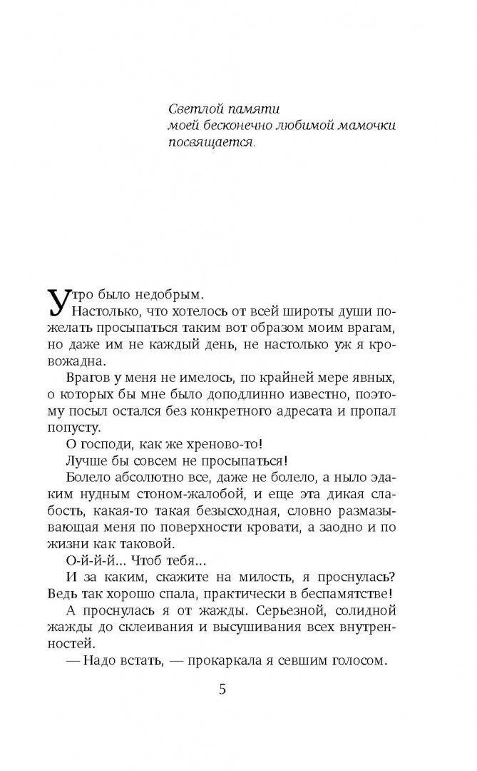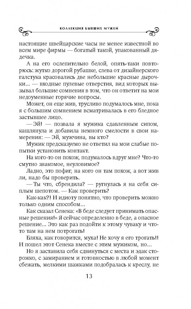 ОписаниеПроснувшись как-то утром, Кира обнаружила в собственной гостиной труп своего бывшего мужа, продолжительность брака с которым составляла чуть больше двух недель. Абсурднее ситуации не придумаешь, но судьба иногда оказывается весьма изобретательной, и Кире предстоит получить еще немало сюрпризов, не самым приятным из которых станет тесное общение со следственными органами и приезд ее первого бывшего мужа.Проснувшись как-то утром, Кира обнаружила в собственной гостиной труп своего бывшего мужа, продолжительность брака с которым составляла чуть больше двух недель. Абсурднее ситуации не придумаешь, но судьба иногда оказывается весьма изобретательной, и Кире предстоит получить еще немало сюрпризов, не самым приятным из которых станет тесное общение со следственными органами и приезд ее первого бывшего мужа.