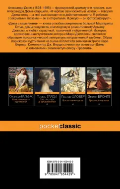 ОписаниеАлександр Дюма (1824-1895) - французский драматург и прозаик. Сын Александра Дюма-старшего и Катрины Лабе, простой парижской работницы, от которой унаследовал любовь к спокойному образу жизни, так резко отличающую его от чисто богемной натуры отца. Прожил долгую насыщенную жизнь, в которой было место и бурным романам, и литературной работе. Дюма-сын затрагивал наболевшие вопросы общественной и семейной жизни со смелостью и талантом, делавшими из каждого его произведения общественное событие. "Я черпаю свои сюжеты в мечтах, - говорил Дюма-отец, - а мой сын находит их в действительности. Я работаю с закрытыми глазами - он с открытыми. Я рисую - он фотографирует"."Дама с камелиями" - роман о проблемах, на открытое обсуждение которых в середине XIX столетия решался отнюдь не всякий. Это книга о любви смертельно больной Маргариты Готье, дамы полусвета, к молодому и романтичному Арману Дювалю, о любви страстной, трагичной и обреченной.История, вдохновленная чувствами автора к Мари Дюплесси, является образцом психологической литературы несравненной глубины. Образ парижской куртизанки на сцене воплотила великая актриса Сара Бернар, а в кинематографе - звезда мировой величины Грета Гарбо. На премьере пьесы, созданной по роману, побывал композитор Дж. Верди, впоследствии сочинивший по мотивам "Дамы с камелиями" знаменитую оперу "Травиата".СвернутьАлександр Дюма (1824-1895) - французский драматург и прозаик. Сын Александра Дюма-старшего и Катрины Лабе, простой парижской работницы, от которой унаследовал любовь к спокойному образу жизни, так резко отличающую его от чисто богемной натуры отца. Прожил долгую насыщенную жизнь, в которой было место и бурным романам, и литературной работе. Дюма-сын затрагивал наболевшие вопросы общественной и семейной жизни со смелостью и талантом, делавшими из каждого его произведения общественное событие. "Я черпаю свои сюжеты в мечтах, - говорил Дюма-отец, - а мой сын находит их в действительности. Я работаю с закрытыми глазами - он с открытыми. Я рисую - он фотографирует"."Дама с камелиями" - роман о проблемах, на открытое обсуждение которых в середине XIX столетия решался отнюдь не всякий. Это книга о любви смертельно больной Маргариты Готье, дамы полусвета, к молодому и романтичному Арману Дювалю, о любви страстной, трагичной и обреченной.История, вдохновленная чувствами автора к Мари Дюплесси, является образцом психологической литературы несравненной глубины. Образ парижской куртизанки на сцене воплотила великая актриса Сара Бернар, а в кинематографе - звезда мировой величины Грета Гарбо. На премьере пьесы, созданной по роману, побывал композитор Дж. Верди, впоследствии сочинивший по мотивам "Дамы с камелиями" знаменитую оперу "Травиата".СвернутьСвернуть