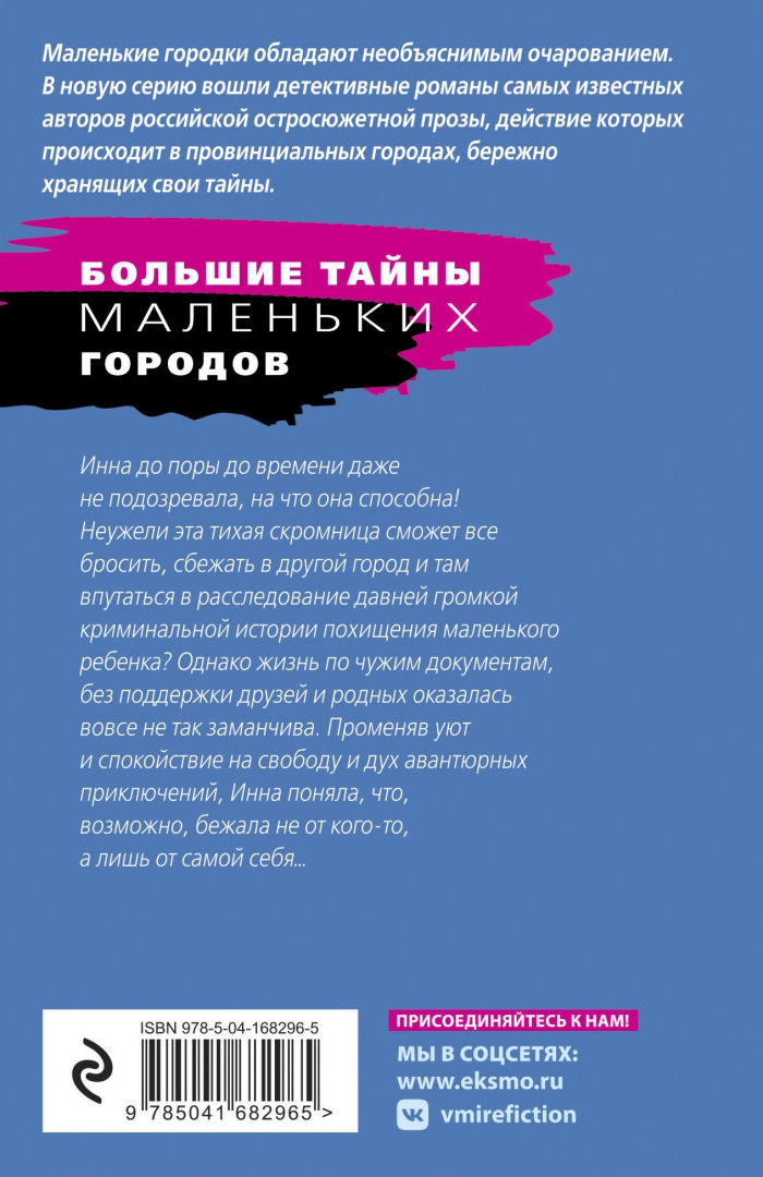ОписаниеИнна до поры до времени даже не подозревала, на что она способна! Неужели эта тихая скромница сможет все бросить, сбежать в другой город и там впутаться в расследование давней громкой криминальной истории похищения маленького ребенка? Однако жизнь по чужим документам, без поддержки друзей и родных, оказалась вовсе не так заманчива. Променяв уют и спокойствие на свободу и дух авантюрных приключений, Инна поняла, что, возможно, бежала не от кого-то, а лишь от самой себя… Татьяна Полякова - один из самых популярных российских писателей в жанре детектива. За время писательской карьеры из-под ее пера вышло более 85 книг общим тиражом более 36 миллионов экземпляров. По свидетельствам читателей, романы Татьяны Поляковой - это "захватывающий сюжет и непредсказуемая развязка, обаятельные герои и невероятные приключения, легкий стиль и яркие диалоги".Инна до поры до времени даже не подозревала, на что она способна! Неужели эта тихая скромница сможет все бросить, сбежать в другой город и там впутаться в расследование давней громкой криминальной истории похищения маленького ребенка? Однако жизнь по чужим документам, без поддержки друзей и родных, оказалась вовсе не так заманчива. Променяв уют и спокойствие на свободу и дух авантюрных приключений, Инна поняла, что, возможно, бежала не от кого-то, а лишь от самой себя… Татьяна Полякова - один из самых популярных российских писателей в жанре детектива. За время писательской карьеры из-под ее пера вышло более 85 книг общим тиражом более 36 миллионов экземпляров. По свидетельствам читателей, романы Татьяны Поляковой - это "захватывающий сюжет и непредсказуемая развязка, обаятельные герои и невероятные приключения, легкий стиль и яркие диалоги".