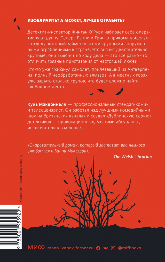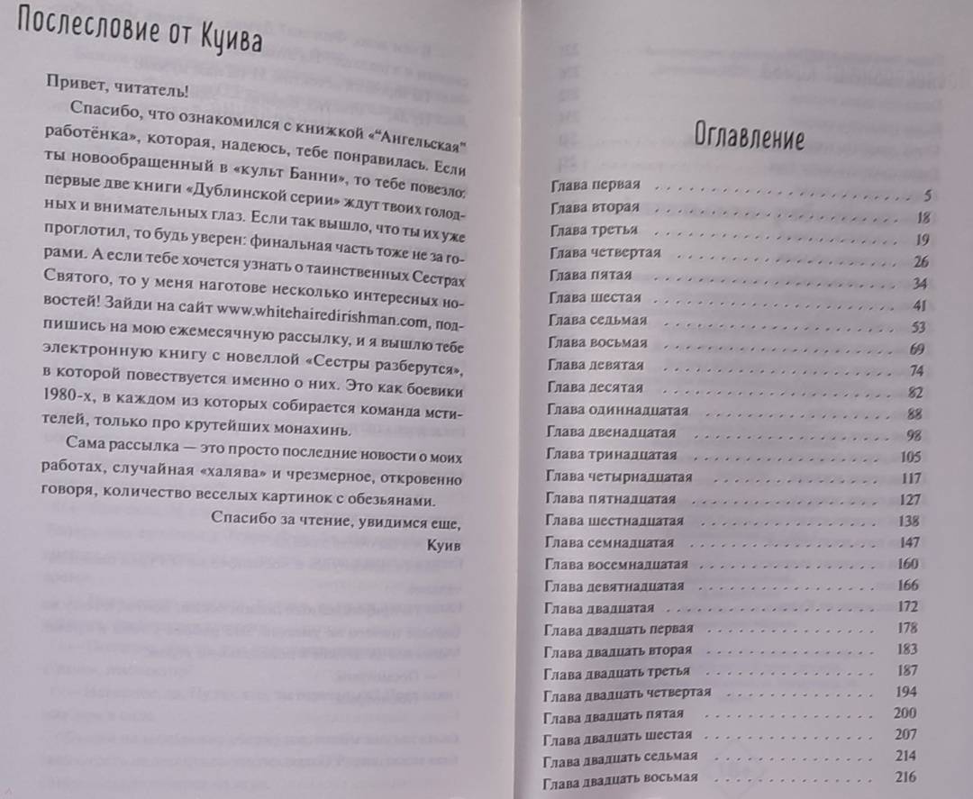 Описание""Ангельская" работёнка" - приквел к основной трилогии "Дублинской серии".У детектива Банни Макгэрри ужасно сложная жизнь, и скоро она станет еще сложнее. На дворе 1999 год, он только-только завоевал репутацию огромной занозы в заднице среди криминального дублинского сообщества. К сожалению, это мнение разделяют и его боссы.Детектив ставит перед собой задачу уничтожить самую искусную и безжалостную банду грабителей в истории Ирландии. Так что последнее, что ему нужно, - это еще одна проблема. Но она, конечно же, появляется.Ее зовут Симона. Она умная, веселая, талантливая и... сложная. Теперь блестящая карьера Банни под угрозой, ведь прошлое возлюбленной может оказаться мрачнее его самых темных фантазий. Скоро детективу-полицейскому придется выбирать между дамой сердца и законом.""Ангельская" работёнка" - это саркастичный, местами грубый юмор, сочетание комедийных и криминальных элементов, запутанный ход событий и особый ирландский колорит. Детективы Макдоннелла сравнивают с произведениями Питера Свонсона, Алекса Михаэлидеса, Жоэля Диккера, Терри Пратчетта и Ричарда Кадри. Право на их экранизацию уже купила компания Avalon - режиссером выступит Крис Эддисон, знакомый многим по сериалу "Вице-президент".Для кого эта книгаДля читателей современных детективов и комедий, юмористической фантастики и мистики.Для тех, кому понравились первые книги серии.Для фанатов Османа и "Клуба убийств по четвергам".Для тех, кто хочет весело провести вечер, читая о приключениях Банни Макгэрри.От автораПривет, читатель!Спасибо, что ознакомился с книжкой ""Ангельская" работёнка", которая, надеюсь, тебе понравилась. Если ты новообращенный в "культ Банни", то тебе повезло: первые две книги "Дублинской серии" ждут твоих голодных и внимательных глаз. Если так вышло, что ты их уже проглотил, то будь уверен: финальная часть тоже не за горами. А если тебе хочется узнать о таинственных Сестрах Святого, то у меня наготове несколько интересных новостей! Зайди на сайт whitehairedirishman, подпишись на мою ежемесячную рассылку, и я вышлю тебе электронную книгу с новеллой "Сестры разберутся", в которой повествуется именно о них. Это как боевики 1980-х, в каждом из которых собирается команда мстителей, только про крутейших монахинь.Спасибо за чтение, увидимся еще, КуивСвернуть""Ангельская" работёнка" - приквел к основной трилогии "Дублинской серии".У детектива Банни Макгэрри ужасно сложная жизнь, и скоро она станет еще сложнее. На дворе 1999 год, он только-только завоевал репутацию огромной занозы в заднице среди криминального дублинского сообщества. К сожалению, это мнение разделяют и его боссы.Детектив ставит перед собой задачу уничтожить самую искусную и безжалостную банду грабителей в истории Ирландии. Так что последнее, что ему нужно, - это еще одна проблема. Но она, конечно же, появляется.Ее зовут Симона. Она умная, веселая, талантливая и... сложная. Теперь блестящая карьера Банни под угрозой, ведь прошлое возлюбленной может оказаться мрачнее его самых темных фантазий. Скоро детективу-полицейскому придется выбирать между дамой сердца и законом.""Ангельская" работёнка" - это саркастичный, местами грубый юмор, сочетание комедийных и криминальных элементов, запутанный ход событий и особый ирландский колорит. Детективы Макдоннелла сравнивают с произведениями Питера Свонсона, Але