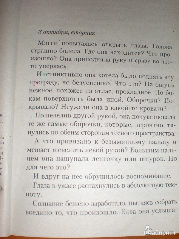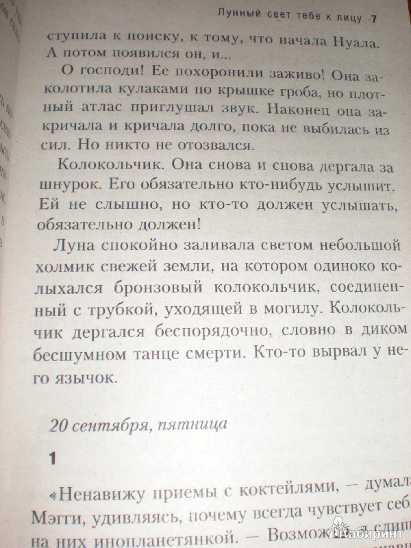 ОписаниеОчнувшись от беспамятства, Мэгги обнаруживает, что она лежит в заколоченном гробу, а к ее пальцу привязана какая-то ленточка. Эта ленточка может означать только одно: Мэгги заживо погребена в могиле, и тот, кто сделал это с ней, следовал древнему обычаю - привязывать колокольчик к пальцу покойного, чтобы человек, случайно похороненный живым, мог подать знак о себе. Девушка в отчаянии дергает за ленточку, но колокольчик, висящий над залитой лунным светом могилой, молчит: у него вырван язычок...Очнувшись от беспамятства, Мэгги обнаруживает, что она лежит в заколоченном гробу, а к ее пальцу привязана какая-то ленточка. Эта ленточка может означать только одно: Мэгги заживо погребена в могиле, и тот, кто сделал это с ней, следовал древнему обычаю - привязывать колокольчик к пальцу покойного, чтобы человек, случайно похороненный живым, мог подать знак о себе. Девушка в отчаянии дергает за ленточку, но колокольчик, висящий над залитой лунным светом могилой, молчит: у него вырван язычок...