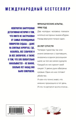 ОписаниеБестселлер топ-5 "The Sunday Times"Четыре гостя. Один элитный курорт. И одно идеальное убийство… Французские Альпы, 1998 годДва молодых человека поехали кататься на горных лыжах в буран.Назад вернулся только один.20 лет спустяЧетверо людей, связанных с пропавшим, оказались в роскошном шале на том же самом курорте. Каждый из них хранит свой секрет. У двоих руки испачканы кровью. Один из них готовит убийство.А кое-кто точно знает, что именно произошло в тот день.И кто-то заплатит за это сполна…Невероятно закрученная детективная история о том, что никто не застрахован от самых неожиданных поворотов судьбы - даже на элитных курортах. И что зло обязательно наказывается - неважно сколько лет назад оно было совершено.Словно Агата Кристи побывала на крутом горнолыжном курорте. Sunday TimesЧистый адреналин - от убийственной первой страницы до леденящей кровь последней строчки.Эрин КеллиВеликолепное динамичное чтение, которое очень понравится армии поклонников Люси Фоли.Fabulous magazineБлестящий роман с таким твистом… Вы даже не почувствуете, что вас вот-вот раскрутит по полной.Bella magazineСвернутьБестселлер топ-5 "The Sunday Times"Четыре гостя. Один элитный курорт. И одно идеальное убийство… Французские Альпы, 1998 годДва молодых человека поехали кататься на горных лыжах в буран.Назад вернулся только один.20 лет спустяЧетверо людей, связанных с пропавшим, оказались в роскошном шале на том же самом курорте. Каждый из них хранит свой секрет. У двоих руки испачканы кровью. Один из них готовит убийство.А кое-кто точно знает, что именно произошло в тот день.И кто-то заплатит за это сполна…Невероятно закрученная детективная история о том, что никто не застрахован от самых неожиданных поворотов судьбы - даже на элитных курортах. И что зло обязательно наказывается - неважно сколько лет назад оно было совершено.Словно Агата Кристи побывала на крутом горнолыжном курорте. Sunday TimesЧистый адреналин - от убийственной первой страницы до леденящей кровь последней строчки.Эрин КеллиВеликолепное динамичное чтение, которое очень понравится армии поклонников Люси Фоли.Fabulous magazineБлестящий роман с таким твистом… Вы даже не почувствуете, что вас вот-вот раскрутит по полной.Bella magazineСвернутьСвернуть