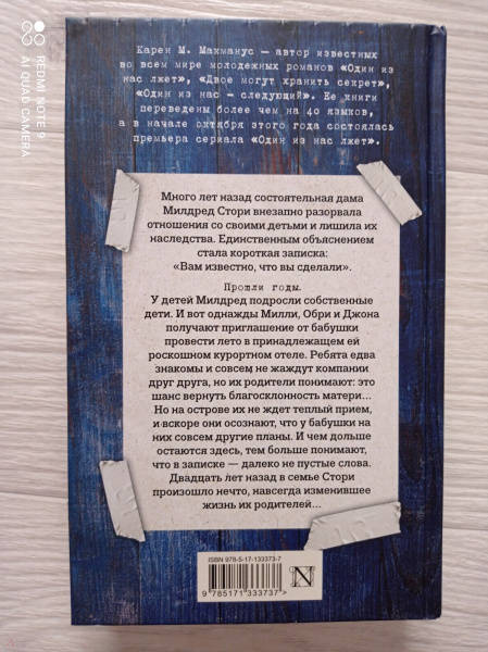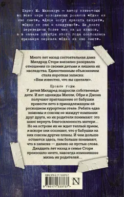 ОписаниеБестселлер №1 по версии New York TimesОт автора всемирно известных молодежных романов "Один из нас лжет", "Двое могут хранить секрет", "Один из нас - следующий". Книги Карен М. Макманус переведены более чем на сорок языков!Много лет назад состоятельная дама Милдред Стори внезапно разорвала отношения со своими детьми и лишила их наследства. Единственным объяснением стала короткая записка: "Вам известно, что вы сделали".Прошли годы. У детей Милдред подросли собственные дети. И вот однажды Милли, Обри и Джона получают приглашение от бабушки провести лето в принадлежащем ей роскошном курортном отеле. Ребята едва знакомы и совсем не жаждут компании друг друга, но их родители понимают - это шанс вернуть благосклонность матери… Но на острове их не ждет теплый прием, и вскоре они осознают, что у бабушки на них совсем другие планы. И чем дольше остаются здесь, тем больше понимают, что в записке - далеко не пустые слова. Двадцать лет назад в семье Стори произошло нечто, навсегда изменившее жизнь их родителей…Новый взрывной триллер от автора культового хита «Один из нас лжет» Карен Макманус.
