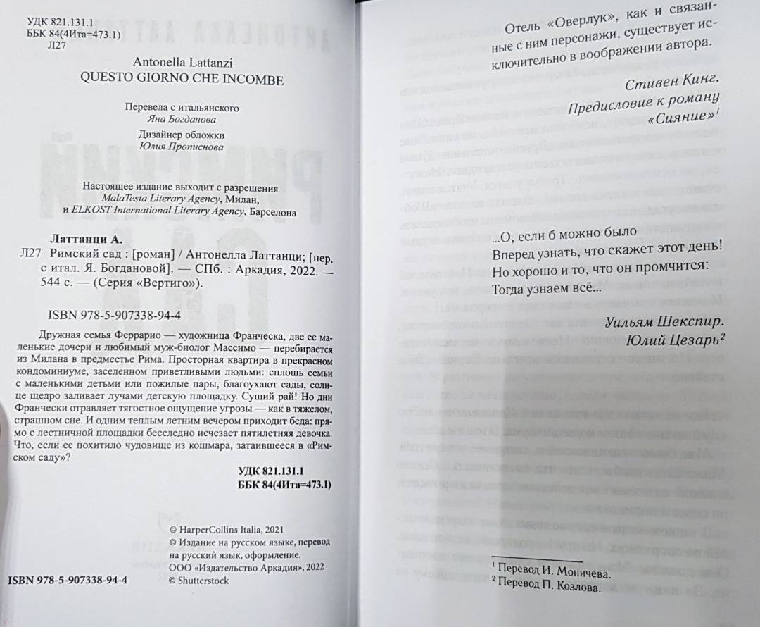 ОписаниеДружная семья Феррарио - художница Франческа, две ее маленькие дочери и любимый муж-биолог Массимо - перебирается из Милана в предместье Рима. Просторная квартира в прекрасном кондоминиуме, заселенном приветливыми людьми: сплошь семьи с маленькими детьми или пожилые пары, благоухают сады, солнце щедро заливает лучами детскую площадку. Сущий рай! Но дни Франчески отравляет тягостное ощущение угрозы - как в тяжелом, страшном сне. И одним теплым летним вечером приходит беда: прямо с лестничной площадки бесследно исчезает пятилетняя девочка. Что, если ее похитило чудовище из кошмара, затаившееся в "Римском саду"?Дружная семья Феррарио - художница Франческа, две ее маленькие дочери и любимый муж-биолог Массимо - перебирается из Милана в предместье Рима. Просторная квартира в прекрасном кондоминиуме, заселенном приветливыми людьми: сплошь семьи с маленькими детьми или пожилые пары, благоухают сады, солнце щедро заливает лучами детскую площадку. Сущий рай! Но дни Франчески отравляет тягостное ощущение угрозы - как в тяжелом, страшном сне. И одним теплым летним вечером приходит беда: прямо с лестничной площадки бесследно исчезает пятилетняя девочка. Что, если ее похитило чудовище из кошмара, затаившееся в "Римском саду"?