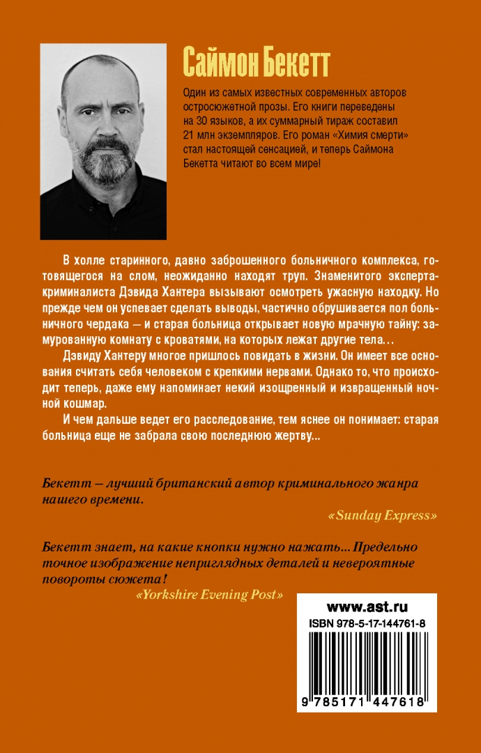 ОписаниеВ холле старинного, давно заброшенного больничного комплекса, готовящегося на слом, неожиданно находят труп. Знаменитого эксперта-криминалиста Дэвида Хантера вызывают осмотреть ужасную находку. Но прежде чем он успевает сделать выводы, частично обрушивается пол больничного чердака - и старая больница открывает новую мрачную тайну: замурованную комнату с кроватями, на которых лежат другие тела… Дэвиду Хантеру многое пришлось повидать в жизни. Он имеет все основания считать себя человеком с крепкими нервами. Однако то, что происходит теперь, даже ему напоминает некий изощренный и извращенный ночной кошмар. И чем дальше ведет его расследование, тем яснее он понимает: старая больница еще не забрала свою последнюю жертву...В холле старинного, давно заброшенного больничного комплекса, готовящегося на слом, неожиданно находят труп. Знаменитого эксперта-криминалиста Дэвида Хантера вызывают осмотреть ужасную находку. Но прежде чем он успевает сделать выводы, частично обрушивается пол больничного чердака - и старая больница открывает новую мрачную тайну: замурованную комнату с кроватями, на которых лежат другие тела… Дэвиду Хантеру многое пришлось повидать в жизни. Он имеет все основания считать себя человеком с крепкими нервами. Однако то, что происходит теперь, даже ему напоминает некий изощренный и извращенный ночной кошмар. И чем дальше ведет его расследование, тем яснее он понимает: старая больница еще не забрала свою последнюю жертву...