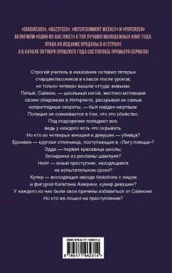 ОписаниеСтрогий учитель в наказание оставил пятерых старшеклассников в классе после уроков, но только четверо вышли оттуда живыми.Пятый, Саймон, - школьный изгой, жестоко мстивший своим обидчикам в Интернете, раскрывая их самые неприглядные секреты, - был найден мертвым. Полиция не сомневается в том, что это убийство. Под подозрение попадают все, ведь у каждого есть что скрывать.Но кто из четверых юношей и девушек - убийца?Бронвин - круглая отличница, поступающая в "Лигу плюща"?Эдди - первая красавица школы, блондинка из рекламы шампуня?Нейт - юный преступник, находящийся на испытательном сроке?Купер - восходящая звезда бейсбола с лицом и фигурой Капитана Америки, кумир девушек? У каждого из них были свои причины избавиться от Саймона. Но кто же пошел на преступление?Культовый детективный триллер Карен МакМанус в новом оформлении. Читай книгу — смотри сериал. В феврале на сервисе Netflix состоялась премьера одноимённого телесериала. Сериал уже продлён на второй сезон.