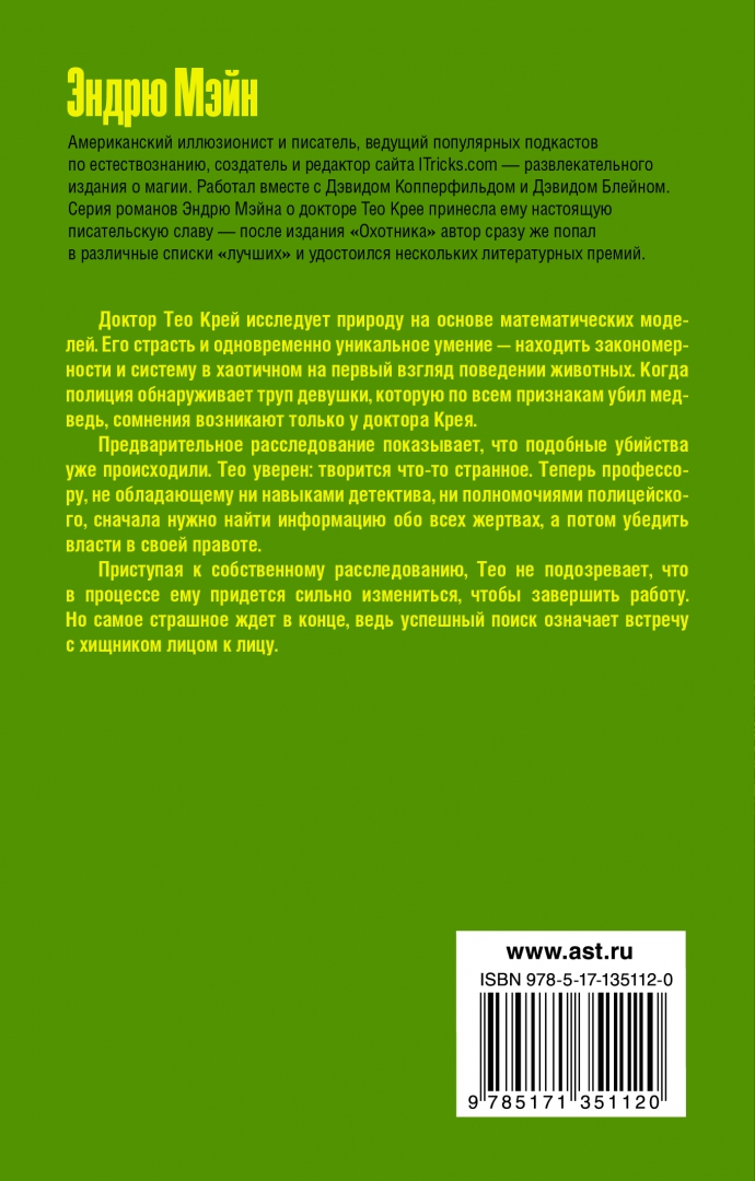 ОписаниеДоктор Тео Крей исследует природу на основе математических моделей. Его страсть и одновременно уникальное умение - находить закономерности и систему в хаотичном на первый взгляд поведении животных. Когда полиция обнаруживает труп девушки, которую по всем признакам убил медведь, сомнения возникают только у доктора Крея. Предварительное расследование показывает, что подобные убийства уже происходили. Тео уверен: творится что-то странное. Теперь профессору, не обладающему ни навыками детектива, ни полномочиями полицейского, сначала нужно найти информацию обо всех жертвах, а потом убедить власти в своей правоте.Приступая к собственному расследованию, Тео не подозревает, что в процессе ему придется сильно измениться, чтобы завершить работу. Но самое страшное ждет в конце, ведь успешный поиск означает встречу с хищником лицом к лицу.Доктор Тео Крей исследует природу на основе математических моделей. Его страсть и одновременно уникальное умение - находить закономерности и систему в хаотичном на первый взгляд поведении животных. Когда полиция обнаруживает труп девушки, которую по всем признакам убил медведь, сомнения возникают только у доктора Крея. Предварительное расследование показывает, что подобные убийства уже происходили. Тео уверен: творится что-то странное. Теперь профессору, не обладающему ни навыками детектива, ни полномочиями полицейского, сначала нужно найти информацию обо всех жертвах, а потом убедить власти в своей правоте.Приступая к собственному расследованию, Тео не подозревает, что в процессе ему придется сильно измениться, чтобы завершить работу. Но самое страшное ждет в конце, ведь успешный поиск означает встречу с хищником лицом к лицу.