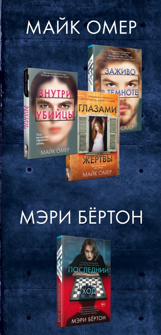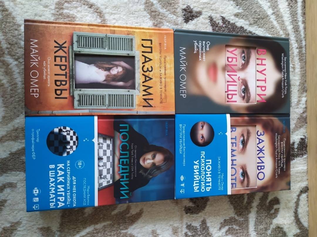 ОписаниеКомплект из 4-х лучших книг о профайлерах и серийных убийцах: "Внутри убийцы", "Заживо в темноте", "Глазами жертвы" и "Последний ход".Чтобы поймать убийцу, нужно смотреть глазами убийцы.Профайлер… Криминальный психолог, буквально по паре незначительных деталей способный воссоздать облик и образ действий самого хитроумного преступника. Эти люди выглядят со стороны как волшебники, как супергерои. Тем более если профайлер - женщина...В комплекте собраны лучшие триллеры о противостоянии профайлеров самым неуловимым и жестоким серийным убийцам современности.Внутри убийцыНа мосту в Чикаго, облокотившись на перила, стоит молодая красивая женщина. Очень бледная и очень грустная. Она неподвижно смотрит на темную воду, прикрывая ладонью плачущие глаза. И никому не приходит в голову, что…ОНА МЕРТВА.На мосту стоит тело задушенной женщины, забальзамированное особым составом, который позволяет придать трупу любую позу. Поистине дьявольская фантазия. Но еще хуже, что таких тел, горюющих о собственной смерти, найдено уже три. В городе появился…СЕРИЙНЫЙ УБИЙЦА.Расследование ведет полиция Чикаго, но ФБР не доверяет местному профайлеру, считая его некомпетентным. Для такого сложного дела у Бюро есть свой специалист - Зои Бентли. Она - лучшая из лучших. Во-многом потому, что когда-то, много лет назад, лично столкнулась с серийным убийцей -И ОСТАЛАСЬ ЖИВА…Заживо в темнотеНиколь приходит в себя - и понимает, что находится в полной темноте, в небольшом замкнутом пространстве. Ее локти и колени упираются в шершавые доски. Почти нечем дышать. Все звуки раздаются глухо, словно под землей… Под землей?!ОНА ПОХОРОНЕНА ЗАЖИВО.Николь начинает кричать и биться в своем гробу. От ужаса перехватывает горло, она ничего не соображает, кроме одного - что выхода отсюда у нее нет. И не замечает, что к доскам над ней прикреплена маленькая инфракрасная видеокамера…ИДЕТ ПРЯМАЯ ИНТЕРНЕТ-ТРАНСЛЯЦИЯ.В это же время "гробовое" видео смотрят профайлер ФБР Зои Бентли и специальный агент Тейтум Грей. Рядом с изображением подпись - "Эксперимент №1". Они понимают: объявился новый серийный маньяк-убийца -И ОБЯЗАТЕЛЬНО БУДЕТ ЭКСПЕРИМЕНТ №2…Глазами жертвыВ этом романе многолетний кошмар Зои Бентли наконец-то закончится. Она найдет ответы на все вопросы…УБИЙЦА, ПЬЮЩИЙ КРОВЬ СВОИХ ЖЕРТВ?Профайлер ФБР Зои Бентли и ее напарник, агент Тейтум Грей повидали в жизни всякое. И все же при виде тела этой мертвой девушки даже их пробирала дрожь.ВАМПИР? - ВРЯД ЛИ. НО И НЕ ЧЕЛОВЕКПочерк убийства схож с жуткими расправами Рода Гловера - маньяка, за которым они гоняются уже не первый месяц. Зои уверена - это его рук дело. Какие же персональные демоны, из каких самых темных глубин подсознания, могут заставить совершать подобные ужасы? Ответ на этот вопрос - ключ ко всему.ОДНАКО МНОГОЕ ВЫГЛЯДИТ СТРАННОУбийство произошло в доме, а не на улице. Жертве зачем-то несколько раз вводили в руку иглу. После смерти кто-то надел ей на шею цепочку с кулоном и укрыл одеялом. И главное: на месте убийства обнаружены следы двух разных пар мужских ботинок…Последний ходКейт Хейден - профайлер ФБР, эксперт по криминалистической лингвистике. Она мастерски вычисляет маньяков по их словам - написанным или сказанным. Но не может держать в узде свои собственные кошмары…Сан-Антонио. Опять этот проклятый город. Город е