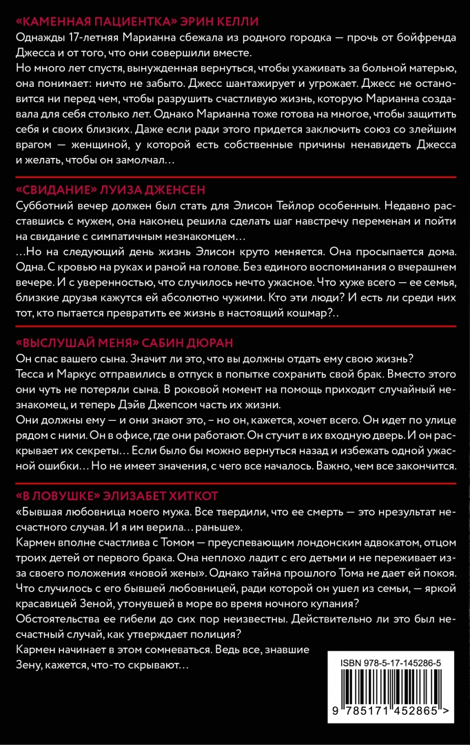 Описание"КАМЕННАЯ ПАЦИЕНТКА" ЭРИН КЕЛЛИОднажды 17-летняя Марианна сбежала из родного городка - прочь от бойфренда Джесса и от того, что они совершили вместе.Но много лет спустя, вынужденная вернуться, чтобы ухаживать за больной матерью, она понимает: ничто не забыто.Джесс шантажирует и угрожает.Джесс не остановится ни перед чем, чтобы разрушить счастливую жизнь, которую Марианна создавала для себя столько лет.Однако Марианна тоже готова на многое, чтобы защитить себя и своих близких.Даже если ради этого придется заключить союз со злейшим врагом - женщиной, у которой есть собственные причины ненавидеть Джесса и желать, чтобы он замолчал..."СВИДАНИЕ" ЛУИЗА ДЖЕНСЕНСубботний вечер должен был стать для Элисон Тейлор особенным. Недавно расставшись с мужем, она наконец решила сделать шаг навстречу переменам и пойти на свидание с симпатичным незнакомцем……Но на следующий день жизнь Элисон круто меняется. Она просыпается дома. Одна. С кровью на руках и раной на голове. Без единого воспоминания о вчерашнем вечере. И с уверенностью, что случилось нечто ужасное. Что хуже всего - ее семья, близкие друзья кажутся ей абсолютно чужими. Кто эти люди? И есть ли среди них тот, кто пытается превратить ее жизнь в настоящий кошмар?.."ВЫСЛУШАЙ МЕНЯ" САБИН ДЮРАНОн спас вашего сына. Значит ли это, что вы должны отдать ему свою жизнь?Тесса и Маркус отправились в отпуск в попытке сохранить свой брак. Вместо этого они чуть не потеряли сына. В роковой момент на помощь приходит случайный незнакомец, и теперь Дэйв Джепсом часть их жизни.Они должны ему - и они знают это, - но он, кажется, хочет всего. Он идет по улице рядом с ними. Он в офисе, где они работают. Он стучит в их входную дверь. И он раскрывает их секреты…Если было бы можно вернуться назад и избежать одной ужасной ошибки…Но не имеет значения, с чего все началось. Важно, чем все закончится."В ЛОВУШКЕ" ЭЛИЗАБЕТ ХИТКОТ"Бывшая любовница моего мужа. Все твердили, что ее смерть - это нрезультат несчастного случая. И я им верила... раньше".Кармен вполне счастлива с Томом - преуспевающим лондонским адвокатом, отцом троих детей от первого брака. Она неплохо ладит с его детьми и не переживает из-за своего положения "новой жены". Однако тайна прошлого Тома не дает ей покоя. Что случилось с его бывшей любовницей, ради которой он ушел из семьи, - яркой красавицей Зеной, утонувшей в море во время ночного купания?Обстоятельства ее гибели до сих пор неизвестны. Действительно ли это был несчастный случай, как утверждает полиция?Кармен начинает в этом сомневаться. Ведь все, знавшие Зену, кажется, что-то скрывают...Свернуть"КАМЕННАЯ ПАЦИЕНТКА" ЭРИН КЕЛЛИОднажды 17-летняя Марианна сбежала из родного городка - прочь от бойфренда Джесса и от того, что они совершили вместе.Но много лет спустя, вынужденная вернуться, чтобы ухаживать за больной матерью, она понимает: ничто не забыто.Джесс шантажирует и угрожает.Джесс не остановится ни перед чем, чтобы разрушить счастливую жизнь, которую Марианна создавала для себя столько лет.Однако Марианна тоже готова на многое, чтобы защитить себя и своих близких.Даже если ради этого придется заключить союз со злейшим врагом - женщиной, у которой есть собственные причины ненавидеть Джесса и желать, чтобы он замолчал..."СВИДАНИЕ" ЛУИЗА ДЖЕНСЕНСубботний вечер должен был стать для Элисон Тейлор особенным. Неда