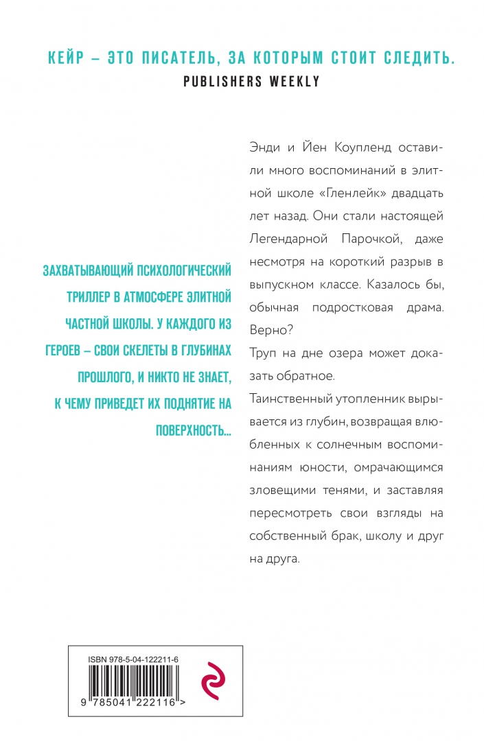 ОписаниеЗахватывающий психологический триллер с атмосферой элитной частной школы, неуловимо схожий с нашумевшей книгой Донны Тарт "Тайная история". Энди и Йен Коупленд оставили много воспоминаний в элитной школе "Гленлейк" двадцать лет назад. Они стали настоящей Легендарной Парочкой, даже несмотря на короткий разрыв в выпускном классе. Казалось бы, обычная подростковая драма. Верно? Труп на дне озера может доказать обратное. Таинственный утопленник вырывается из глубин, возвращая влюбленных к солнечным воспоминаниям юности, омрачающихся зловещими тенями, и заставляя пересмотреть свои взгляды на собственный брак, школу и друг на друга. "Кейр - это писатель, за которым стоит следить". - Publishers Weekly "Это одновременно и увлекательное чтение, и своего рода исследование роли авторитета в атмосфере легендарной частной школы. Вы обнаружите, что стремитесь быстрее добраться до финала, а потом - что его послевкусие остается с вами надолго после прочтения последней страницы". - Меган Эбботт "Зловещий, изощренный и элегантно структурированный триллер. Мина, начиненная неопределенностью, давними секретами, скрытыми историями и манипуляциями. Когда у каждого есть секрет, сможет ли пережить их наличие идеальная семья? Какая захватывающая и оригинальная история! У меня не получалось остановиться". - Хенк Филиппи Райан "Умная, захватывающая загадка, в которой исследуется, как секреты прошлого могут сплотить семью - или навсегда разлучить ее". - Лу Берни "Тело на дне озера. Семейная пара, у которой есть секреты со времен школы-интерната. И их находчивая дочь, способная раскрыть правду, которую она не хочет знать. Захватывающая тайна убийства, изобилующая поэзией, страстью и ложью, захватила меня до самого конца. Роскошная, мрачная сказка, от которой я не могла оторваться!" - Эмили Карпентер "Искусное повествование Линды Кейр о частной школе, разрушенной многолетним скандалом, - соблазнительная история с напряженным ожиданием. Ложь, которую мы произносим, не только определяет нас. Она становится нами". - Эмбер Коуи "Хорошо написанная история, которая не отпускает". - BooklistСвернутьЗахватывающий психологический триллер с атмосферой элитной частной школы, неуловимо схожий с нашумевшей книгой Донны Тарт "Тайная история". Энди и Йен Коупленд оставили много воспоминаний в элитной школе "Гленлейк" двадцать лет назад. Они стали настоящей Легендарной Парочкой, даже несмотря на короткий разрыв в выпускном классе. Казалось бы, обычная подростковая драма. Верно? Труп на дне озера может доказать обратное. Таинственный утопленник вырывается из глубин, возвращая влюбленных к солнечным воспоминаниям юности, омрачающихся зловещими тенями, и заставляя пересмотреть свои взгляды на собственный брак, школу и друг на друга. "Кейр - это писатель, за которым стоит следить". - Publishers Weekly "Это одновременно и увлекательное чтение, и своего рода исследование роли авторитета в атмосфере легендарной частной школы. Вы обнаружите, что стремитесь быстрее добраться до финала, а потом - что его послевкусие остается с вами надолго после прочтения последней страницы". - Меган Эбботт "Зловещий, изощренный и элегантно структурированный триллер. Мина, начиненная неопределенностью, давними секретами, скрытыми историями и манипуляциями. Когда у каждого есть секрет, сможет ли пережить их нал