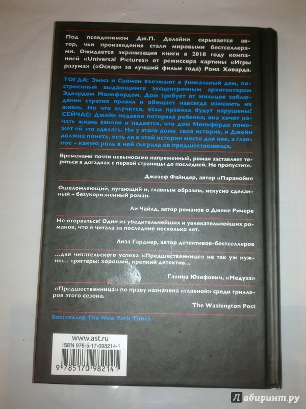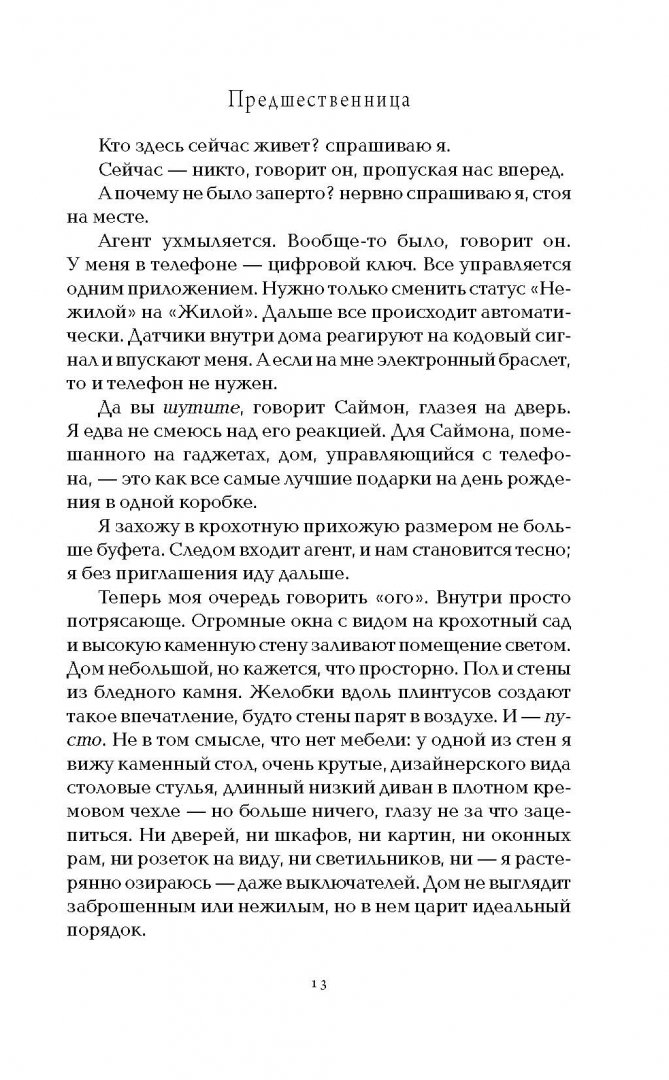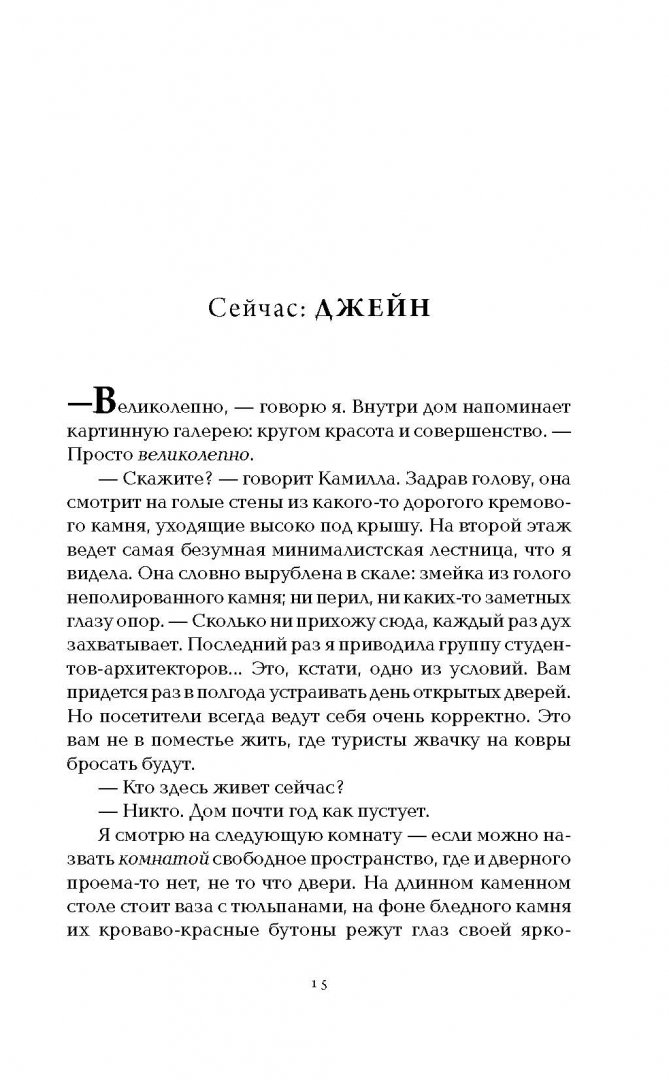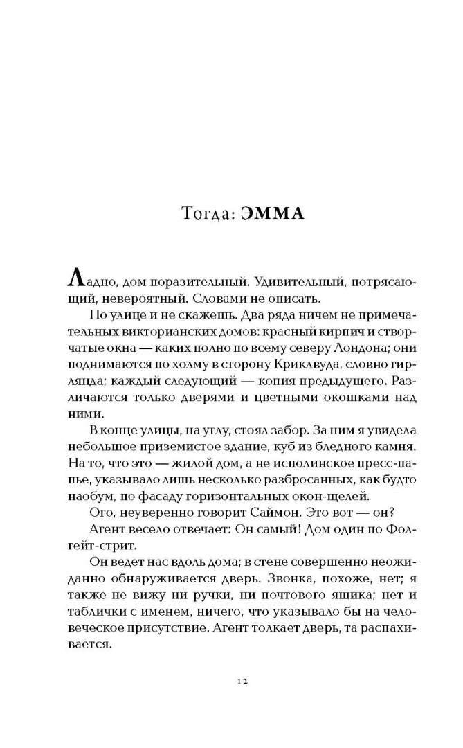 ОписаниеТогда: Эмма и Саймон въезжают в уникальный дом, построенный выдающимся, эксцентричным архитектором Эдвардом Монкфордом. Дом требует от жильцов соблюдения строгих правил и обещает навсегда изменить их жизнь. Но что будет, если правила будут нарушены? Сейчас: Джейн недавно потеряла ребенка; она хочет начать жизнь заново и надеется, что дом Монкфорда поможет ей это сделать. Но у этого дома - своя история, и Джейн должна понять, есть ли в этой истории место для нее, а главное - какую роль в этой истории исполнила Эмма.Тогда: Эмма и Саймон въезжают в уникальный дом, построенный выдающимся, эксцентричным архитектором Эдвардом Монкфордом. Дом требует от жильцов соблюдения строгих правил и обещает навсегда изменить их жизнь. Но что будет, если правила будут нарушены? Сейчас: Джейн недавно потеряла ребенка; она хочет начать жизнь заново и надеется, что дом Монкфорда поможет ей это сделать. Но у этого дома - своя история, и Джейн должна понять, есть ли в этой истории место для нее, а главное - какую роль в этой истории исполнила Эмма.