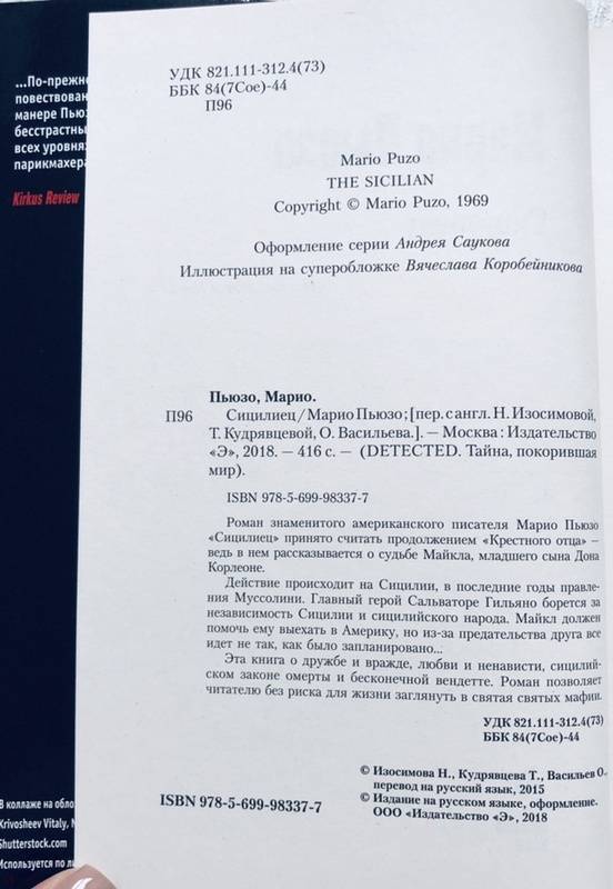 Объем, стр. 416 ISBN 978-5-699-98337-7 Автор Пьюзо Марио, Изосимова Н., Васильев О., Кудрявцева Т. А. Переводчик Изосимова Н., Васильев О., Кудрявцева Т. А. Серия DETECTED. Тайна, покорившая мир Язык Русский Минимальный возраст 16+ Год издания книги 2021 Тип обложки Твердый переплет Иллюстрации Без иллюстраций Вес, г 386г Размеры 209х132х24 мм - Отзывы