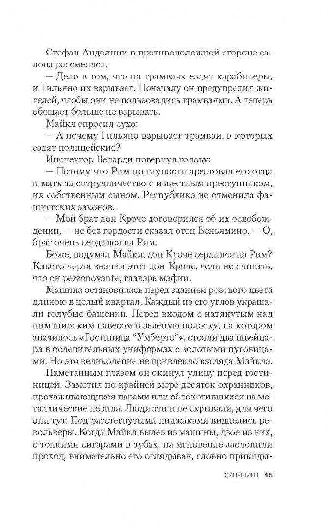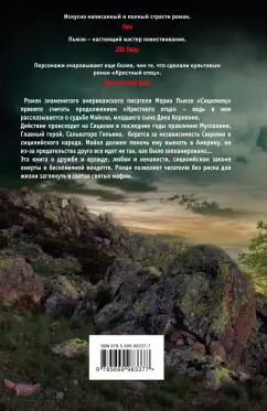 ОписаниеРоман знаменитого американского писателя Марио Пьюзо "Сицилиец" принято считать продолжением "Крестного отца" - ведь в нем рассказывается о судьбе Майкла, младшего сына Дона Корлеоне.Действие происходит на Сицилии, в последние годы правления Муссолини. Главный герой Сальваторе Гильяно борется за независимость Сицилии и сицилийского народа. Майкл должен помочь ему выехать в Америку, но из-за предательства друга все идет не так, как было запланировано...Эта книга о дружбе и вражде, любви и ненависти, сицилийском законе омерты и бесконечной вендетте. Роман позволяет читателю без риска для жизни заглянуть в святая святых мафии.Роман знаменитого американского писателя Марио Пьюзо "Сицилиец" принято считать продолжением "Крестного отца" - ведь в нем рассказывается о судьбе Майкла, младшего сына Дона Корлеоне.Действие происходит на Сицилии, в последние годы правления Муссолини. Главный герой Сальваторе Гильяно борется за независимость Сицилии и сицилийского народа. Майкл должен помочь ему выехать в Америку, но из-за предательства друга все идет не так, как было запланировано...Эта книга о дружбе и вражде, любви и ненависти, сицилийском законе омерты и бесконечной вендетте. Роман позволяет читателю без риска для жизни заглянуть в святая святых мафии.