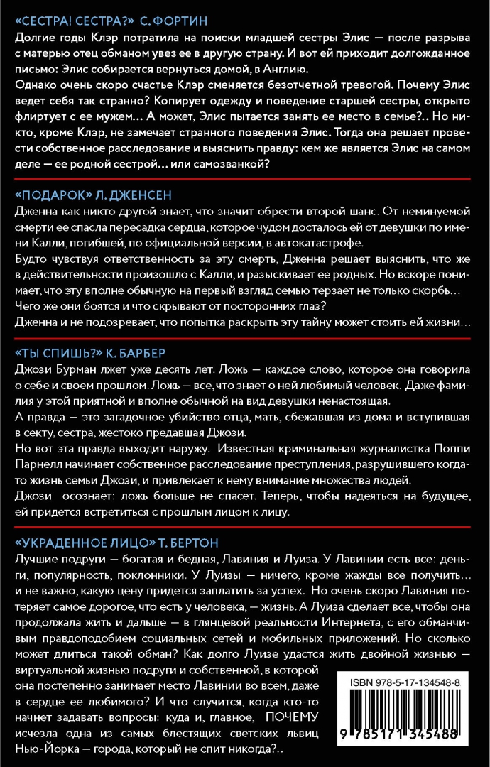 ОписаниеС. Фортин "Сестра! Сестра?"Долгие годы Клэр потратила на поиски младшей сестры Элис - после разрыва с матерью отец обманом увез ее в другую страну. И вот ей приходит долгожданное письмо: Элис собирается вернуться домой, в Англию.Однако очень скоро счастье Клэр сменяется безотчетной тревогой. Почему Элис ведет себя так странно? Копирует одежду и поведение старшей сестры, открыто флиртует с ее мужем… А может, Элис пытается занять ее место в семье?.. Но никто, кроме Клэр, не замечает странного поведения Элис. Тогда она решает провести собственное расследование и выяснить правду: кем же является Элис на самом деле - ее родной сестрой… или самозванкой?Л. Дженсен "Подарок"Дженна как никто другой знает, что значит обрести второй шанс. От неминуемой смерти ее спасла пересадка сердца, которое чудом досталось ей от девушки по имени Калли, погибшей, по официальной версии, в автокатастрофе.Будто чувствуя ответственность за эту смерть, Дженна решает выяснить, что же в действительности произошло с Калли, и разыскивает ее родных. Но вскоре понимает, что эту вполне обычную, на первый взгляд, семью терзает не только скорбь...Чего же они боятся и что скрывают от посторонних глаз?Дженна и не подозревает, что попытка раскрыть эту тайну может стоить ей жизни…К. Барбер "Ты спишь?"Джози Бурман лжет уже десять лет. Ложь - каждое слово, которое она говорила о себе и своем прошлом. Ложь - все, что знает о ней любимый человек. Даже фамилия у этой приятной и вполне обычной на вид девушки ненастоящая.А правда - это загадочное убийство отца, мать, сбежавшая из дома и вступившая в секту, сестра, жестоко предавшая Джози.Но вот эта правда выходит наружу. Известная криминальная журналистка Поппи Парнелл начинает собственное расследование преступления, разрушившего когда-то жизнь семьи Джози, и привлекает к нему внимание множества людей.Джози осознает: ложь больше не спасет. Теперь, чтобы надеяться на будущее, ей придется встретиться с прошлым лицом к лицу.Т. Бертон "Украденное лицо"Лучшие подруги - богатая и бедная, Лавиния и Луиза.У Лавинии есть всё: деньги, популярность, поклонники. У Луизы - ничего, кроме жажды всё получить... и не важно, какую цену придется заплатить за успех. Но очень скоро Лавиния потеряет самое дорогое, что есть у человека, - жизнь. А Луиза сделает всё, чтобы она продолжала жить и дальше - в глянцевой реальности Интернета, с его обманчивым правдоподобием социальных сетей и мобильных приложений. Но сколько может длиться такой обман? Как долго Луизе удастся жить двойной жизнью - виртуальной жизнью подруги и собственной, в которой она постепенно занимает место Лавинии во всем, даже в сердце ее любимого? И что случится, когда кто-то начнет задавать вопросы: куда и, главное, ПОЧЕМУ исчезла одна из самых блестящих светских львиц Нью-Йорка - города, который не спит никогда?..СвернутьС. Фортин "Сестра! Сестра?"Долгие годы Клэр потратила на поиски младшей сестры Элис - после разрыва с матерью отец обманом увез ее в другую страну. И вот ей приходит долгожданное письмо: Элис собирается вернуться домой, в Англию.Однако очень скоро счастье Клэр сменяется безотчетной тревогой. Почему Элис ведет себя так странно? Копирует одежду и поведение старшей сестры, открыто флиртует с ее мужем… А может, Элис пытается занять ее место в семье?.. Но никто, кроме Клэр, не замечает с