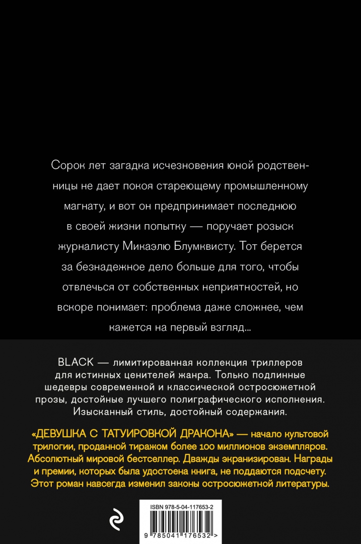 Объем, стр. 544 ISBN 978-5-04-117653-2 Автор Ларссон Стиг, Мурадян К. Е. Переводчик Мурадян К. Е. Серия Black. Триллеры для ценителей Минимальный возраст 16+ Год издания книги 2021 Тип обложки Твердый переплет Иллюстрации Без иллюстраций Вес, г 520г Размеры 220х155х35 мм - Отзывы