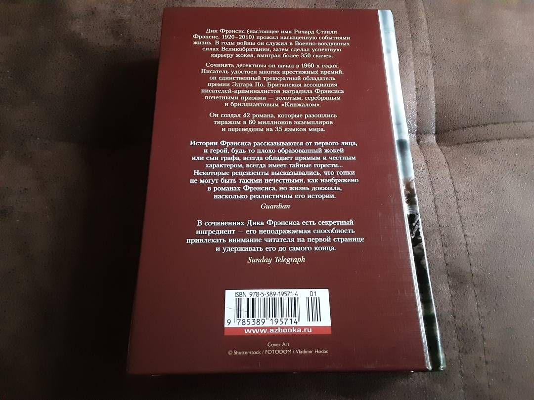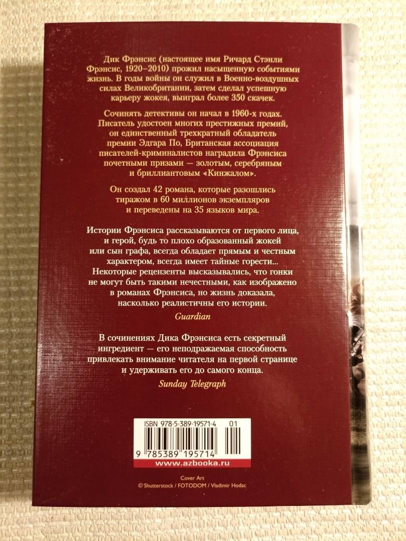 ОписаниеДик Фрэнсис (1920–2010) — один из самых именитых английских авторов, писавших в жанре детектива. За свою жизнь он создал более 30 бестселлеров, получивших международное признание. Его романы посвящены преимущественно миру скачек — Фрэнсис знал его не понаслышке, ведь он родился в семье жокея и сам был знаменитым жокеем. Этот мир полон азарта, здесь кипят нешуточные страсти вокруг великолепных лошадей и крупных ставок в тотализаторах, здесь есть чем поживиться мошенникам. Все это и послужило материалом для увлекательных романов 1960-х годов «Фаворит», «Кураж», «Последний барьер» и «Бурный финиш», которые стали бестселлерами во многих странах мира.Дик Фрэнсис (1920–2010) — один из самых именитых английских авторов, писавших в жанре детектива. За свою жизнь он создал более 30 бестселлеров, получивших международное признание. Его романы посвящены преимущественно миру скачек — Фрэнсис знал его не понаслышке, ведь он родился в семье жокея и сам был знаменитым жокеем. Этот мир полон азарта, здесь кипят нешуточные страсти вокруг великолепных лошадей и крупных ставок в тотализаторах, здесь есть чем поживиться мошенникам. Все это и послужило материалом для увлекательных романов 1960-х годов «Фаворит», «Кураж», «Последний барьер» и «Бурный финиш», которые стали бестселлерами во многих странах мира.