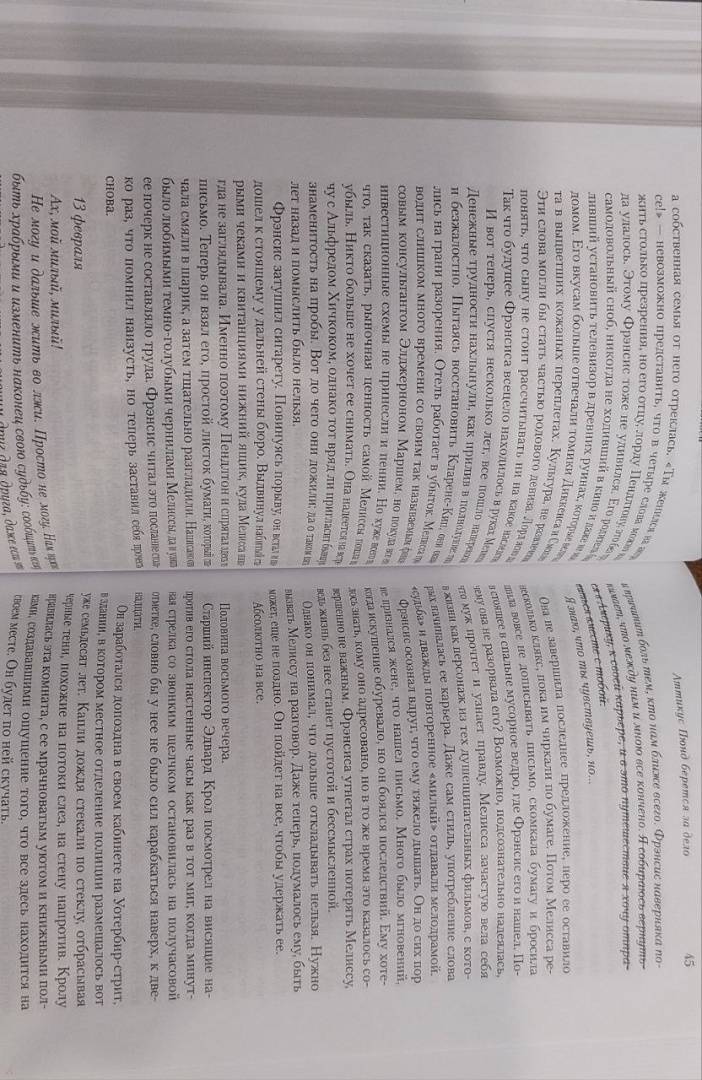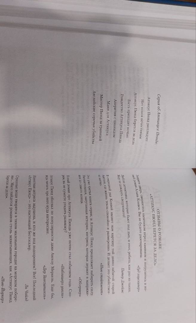 Роман в романе, литературная игра, полная загадок и мистификаций. Впервые на русском!СвернутьСмерть знаменитого писателя Алана Конвея поставила точку в редакторской карьере Сьюзен Райленд. Теперь она управляет отелем на берегу Эгейского моря, однако не слишком успешно — денег катастрофически не хватает. Скучая по лондонской суете, Сьюзен подумывает о том, не сбежать ли из этого райского местечка, и кажется, сама судьба подкидывает ей шанс. Супруги-англичане обращаются к Райленд за помощью, обещая хорошо заплатить. Исчезла их дочь, успев признаться родителям, что на страницах детективного романа Конвея нашла ключ к разгадке кровавого преступления, совершенного восемь лет назад в Суффолке... Редактором этой книжной серии, оказывается, была Сьюзен. Удастся ли ей распутать хитросплетения авторской мысли? Мисс Райленд срочно отправляется в Англию, испытывая настоящий азарт сыщика, и ей не сразу приходит в голову, что нельзя безнаказанно ворошить тайны прошлого. Но это становится очевидным, когда над ней нависает смертельная опасность...