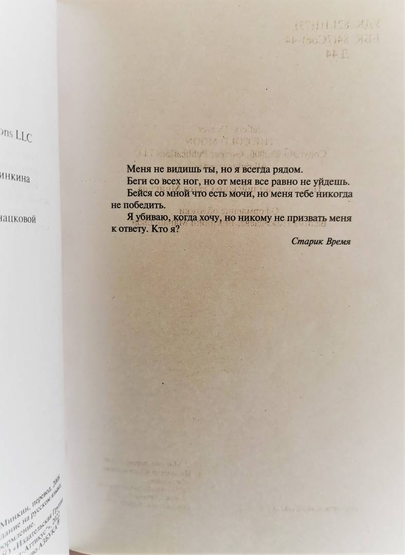 ОписаниеВ Нью-Йорке начал орудовать серийный убийца, и у него очевидные планы на будущее. Он одержим точным подсчетом времени и называет себя Часовщиком. Последние минуты жизни его жертв отсчитывают старинные часы с изображенной на циферблате луной, которые он оставляет на месте преступления, и это единственная зацепка. Гениальный криминалист Линкольн Райм, прикованный к инвалидному креслу, вместе со своей ученицей и помощницей Амелией Сакс берется за расследование этого необычного дела. На сей раз в команде детективов появляется новый сильный игрок, Кэтрин Дэнс, полицейский психолог, специалист по кинесике — языку тела, ведь «самыми опасными преступниками, как правило, бывают те, чьи мотивы сложно понять». Но логика преступника неуловима, как и он сам, непредсказуемый, просчитывающий каждый свой шаг и каждую секунду в жутких сценариях убийств...В Нью-Йорке начал орудовать серийный убийца, и у него очевидные планы на будущее. Он одержим точным подсчетом времени и называет себя Часовщиком. Последние минуты жизни его жертв отсчитывают старинные часы с изображенной на циферблате луной, которые он оставляет на месте преступления, и это единственная зацепка. Гениальный криминалист Линкольн Райм, прикованный к инвалидному креслу, вместе со своей ученицей и помощницей Амелией Сакс берется за расследование этого необычного дела. На сей раз в команде детективов появляется новый сильный игрок, Кэтрин Дэнс, полицейский психолог, специалист по кинесике — языку тела, ведь «самыми опасными преступниками, как правило, бывают те, чьи мотивы сложно понять». Но логика преступника неуловима, как и он сам, непредсказуемый, просчитывающий каждый свой шаг и каждую секунду в жутких сценариях убийств...