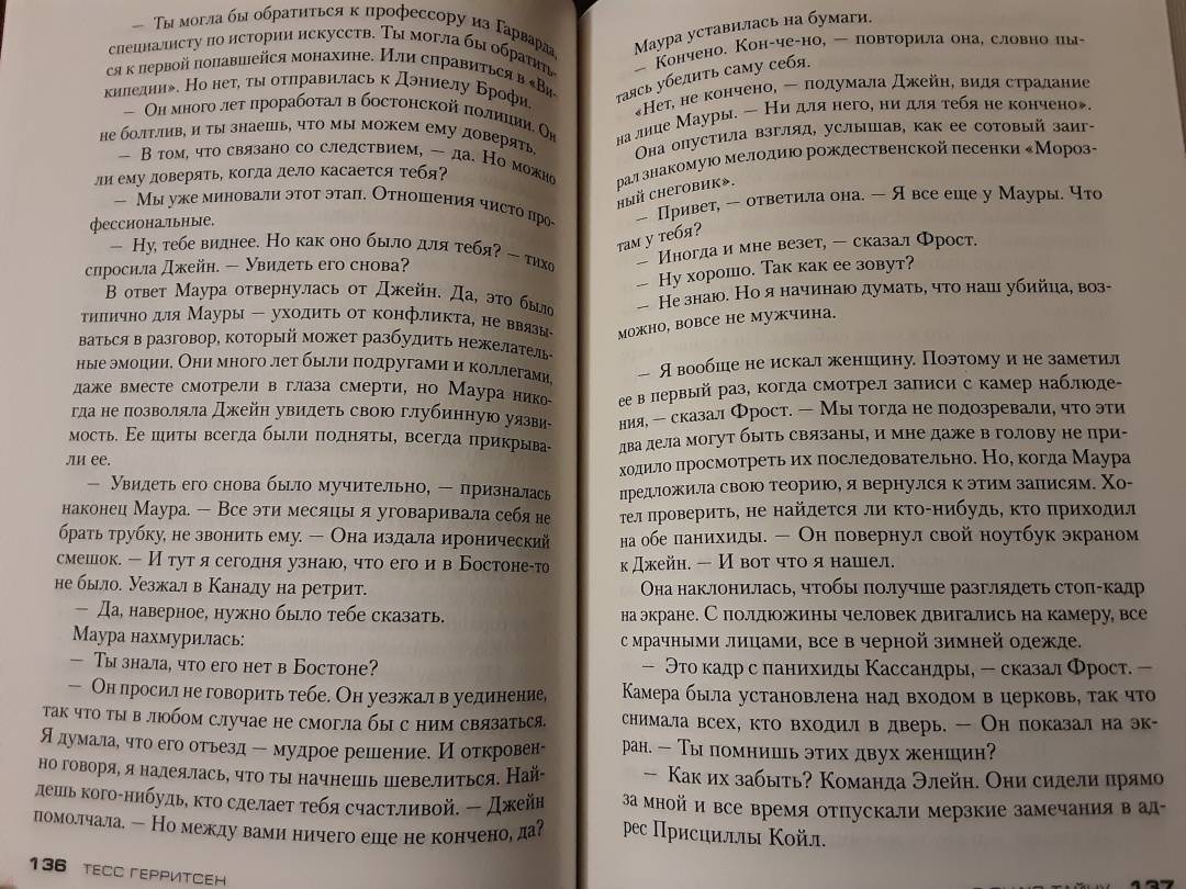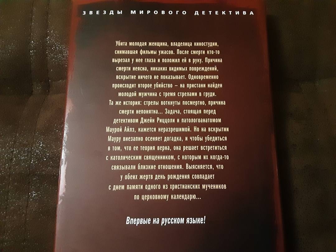 ОписаниеУбита молодая женщина, владелица киностудии, снимавшая фильмы ужасов. После смерти кто-то вырезал у нее глаза и положил ей в руку. Причина смерти неясна, никаких видимых повреждений, вскрытие ничего не показывает. Одновременно происходит второе убийство — на пристани найден молодой мужчина с тремя стрелами в груди. Та же история: стрелы воткнуты посмертно, причина смерти непонятна... Задача, стоящая перед детективом Джейн Риццоли и патологоанатомом Маурой Айлз, кажется неразрешимой. Но на вскрытии Мауру внезапно осеняет догадка, и чтобы убедиться в том, что ее теория верна, она решает встретиться с католическим священником, с которым их когда-то связывали близкие отношения. Выясняется, что у обеих жертв день рождения совпадает с днем памяти одного из христианских мучеников по церковному календарю...Убита молодая женщина, владелица киностудии, снимавшая фильмы ужасов. После смерти кто-то вырезал у нее глаза и положил ей в руку. Причина смерти неясна, никаких видимых повреждений, вскрытие ничего не показывает. Одновременно происходит второе убийство — на пристани найден молодой мужчина с тремя стрелами в груди. Та же история: стрелы воткнуты посмертно, причина смерти непонятна... Задача, стоящая перед детективом Джейн Риццоли и патологоанатомом Маурой Айлз, кажется неразрешимой. Но на вскрытии Мауру внезапно осеняет догадка, и чтобы убедиться в том, что ее теория верна, она решает встретиться с католическим священником, с которым их когда-то связывали близкие отношения. Выясняется, что у обеих жертв день рождения совпадает с днем памяти одного из христианских мучеников по церковному календарю...