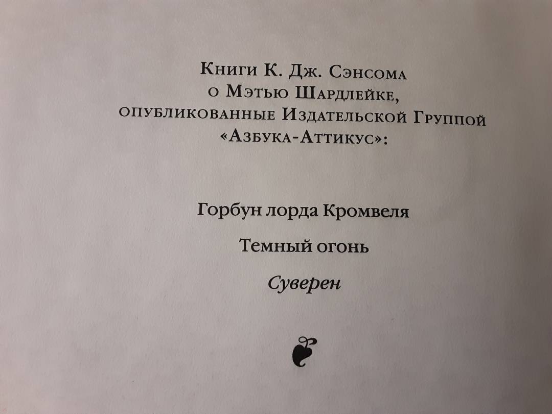 ОписаниеЛето 1541 года. Король Англии Генрих VIII, обеспокоенный попыткой мятежа, собирается посетить Йорк на севере королевства, чтобы предотвратить возможное повторение бунта. Мэтью Шардлейк, включенный в королевскую свиту, отправляется в Йорк заранее с секретным заданием доставить в Лондон организатора неудавшегося мятежа. Со своим помощником Шардлейк селится в аббатстве Святой Марии, которое должно стать временной резиденцией короля. Тут-то и начинается череда таинственных происшествий. Сначала погибает витражных дел мастер Олдройд. При осмотре дома убитого обнаружен тайник со шкатулкой, содержащей старинные документы. Следующей жертвой становится сам Шардлейк. От удара по голове он теряет сознание, и найденные бумаги, способные пролить свет на истинных инициаторов заговора, исчезают... В мире литературных героев и в сознании сегодняшнего читателя образ Мэтью Шардлейка занимает почетное место в ряду с такими известными персонажами, как Шерлок Холмс, Эркюль Пуаро, Ниро Вульф и комиссар Мегрэ.СвернутьЛето 1541 года. Король Англии Генрих VIII, обеспокоенный попыткой мятежа, собирается посетить Йорк на севере королевства, чтобы предотвратить возможное повторение бунта. Мэтью Шардлейк, включенный в королевскую свиту, отправляется в Йорк заранее с секретным заданием доставить в Лондон организатора неудавшегося мятежа. Со своим помощником Шардлейк селится в аббатстве Святой Марии, которое должно стать временной резиденцией короля. Тут-то и начинается череда таинственных происшествий. Сначала погибает витражных дел мастер Олдройд. При осмотре дома убитого обнаружен тайник со шкатулкой, содержащей старинные документы. Следующей жертвой становится сам Шардлейк. От удара по голове он теряет сознание, и найденные бумаги, способные пролить свет на истинных инициаторов заговора, исчезают... В мире литературных героев и в сознании сегодняшнего читателя образ Мэтью Шардлейка занимает почетное место в ряду с такими известными персонажами, как Шерлок Холмс, Эркюль Пуаро, Ниро Вульф и комиссар Мегрэ.СвернутьСвернуть