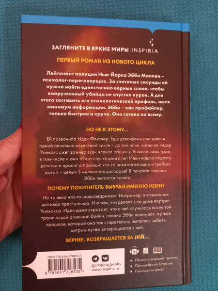 ОписаниеОт автора супербестселлера "Внутри убийцы".Первый роман из нового цикла. Лейтенант полиции Нью-Йорка Эбби Маллен - психолог-переговорщик. За считанные секунды ей нужно найти единственно верные слова, чтобы вооруженный убийца не спустил курок. А для этого - составить его психологический профиль, имея минимум информации. Эбби - как профайлер, только быстрее и круче. Она готова ко всему. Но не к этому… Ей позвонила Иден Флетчер. Еще девочками они жили в одной печально известной секте - до той ночи, когда ее лидер Уилкокс сжег заживо всех членов общины. Выжили лишь трое, в том числе и они. И вот спустя много лет Иден нашла подругу детства и просит о помощи: кто-то похитил ее сына и требует выкуп - целых 5 миллионов долларов! В поисках зацепок Эбби пытается понять: Почему похититель выбрал именно Иден? Но та явно что-то недоговаривает. Например, о возможных мотивах преступника. И о том, что делает в ее доме портрет Уилкокса. Иден даже скрывает, что с ней случилось после той трагической огненной бойни. Постепенно Эбби понимает: жуткое прошлое, которое она так старательно пыталась забыть, хитрым путем возвращается к ней. Вернее, возвращается за ней…СвернутьОт автора супербестселлера "Внутри убийцы".Первый роман из нового цикла. Лейтенант полиции Нью-Йорка Эбби Маллен - психолог-переговорщик. За считанные секунды ей нужно найти единственно верные слова, чтобы вооруженный убийца не спустил курок. А для этого - составить его психологический профиль, имея минимум информации. Эбби - как профайлер, только быстрее и круче. Она готова ко всему. Но не к этому… Ей позвонила Иден Флетчер. Еще девочками они жили в одной печально известной секте - до той ночи, когда ее лидер Уилкокс сжег заживо всех членов общины. Выжили лишь трое, в том числе и они. И вот спустя много лет Иден нашла подругу детства и просит о помощи: кто-то похитил ее сына и требует выкуп - целых 5 миллионов долларов! В поисках зацепок Эбби пытается понять: Почему похититель выбрал именно Иден? Но та явно что-то недоговаривает. Например, о возможных мотивах преступника. И о том, что делает в ее доме портрет Уилкокса. Иден даже скрывает, что с ней случилось после той трагической огненной бойни. Постепенно Эбби понимает: жуткое прошлое, которое она так старательно пыталась забыть, хитрым путем возвращается к ней. Вернее, возвращается за ней…СвернутьСвернуть