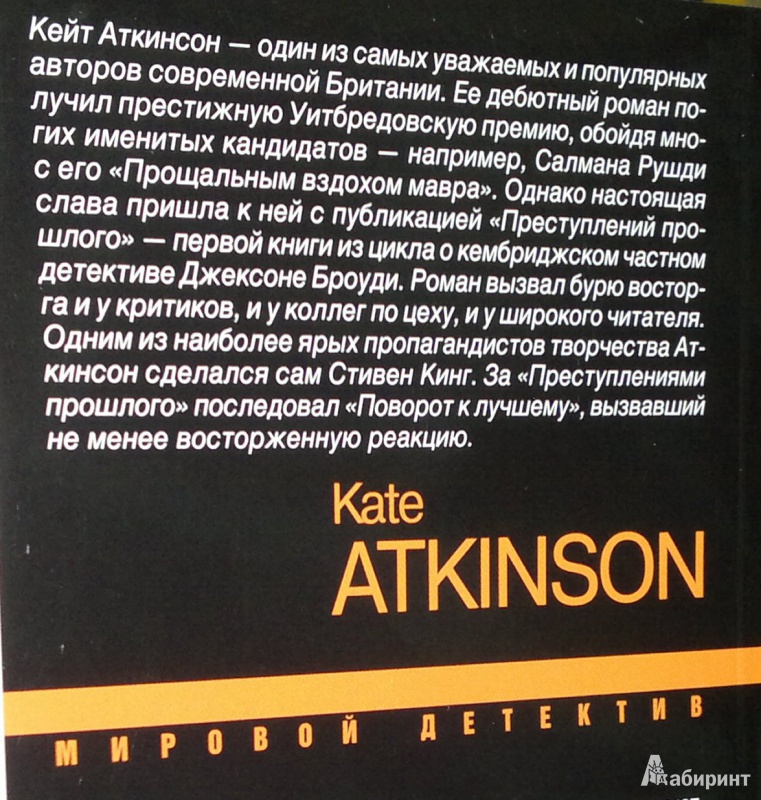 Объем, стр. 448 ISBN 978-5-389-04583-5 Автор Аткинсон Кейт, Нуянзина Мария Переводчик Нуянзина Мария Серия Мировой детектив Год издания книги 2012 Тип обложки Мягкий переплет Иллюстрации Без иллюстраций Вес, г 214г Размеры 180х115х18 мм - Отзывы