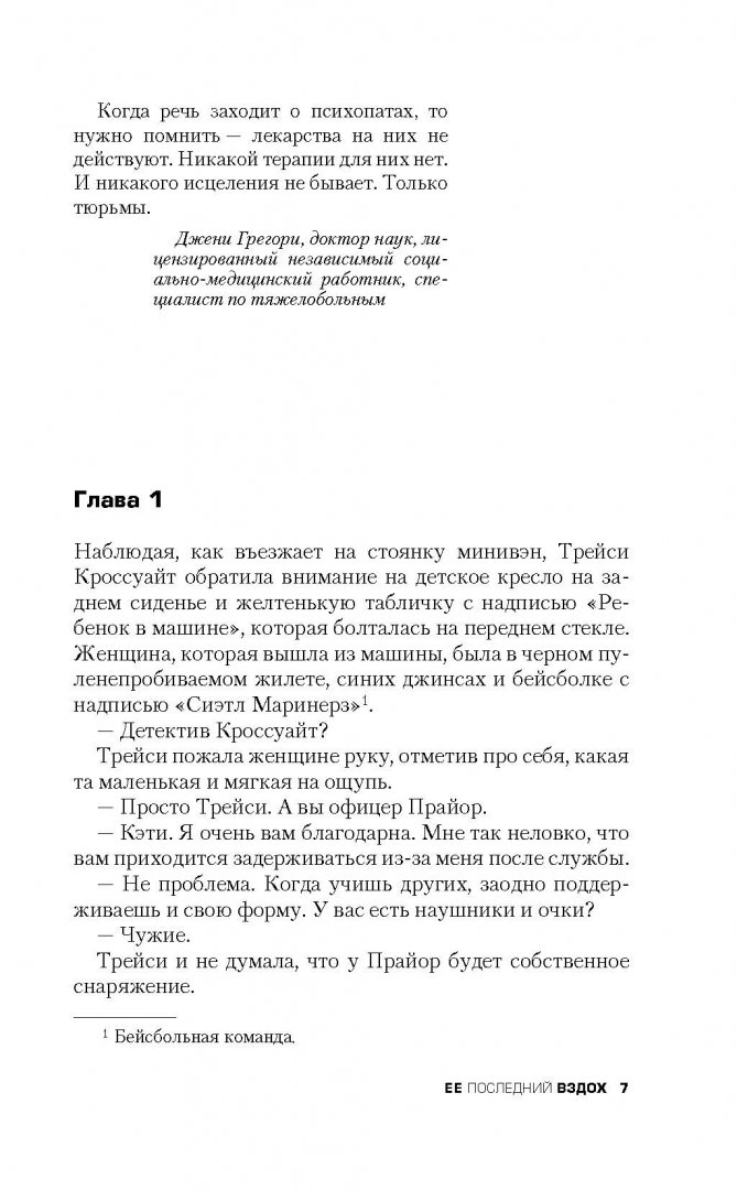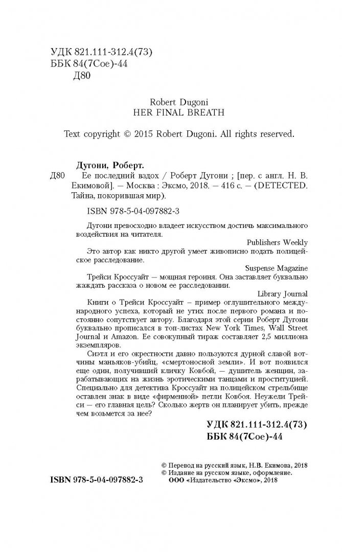ОписаниеДугони превосходно владеет искусством достичь максимального воздействия на читателя.Publishers Weekly Это автор как никто другой умеет живописно подать полицейское расследование.Suspense MagazineТрейси Кроссуайт - мощная героиня. Она заставляет буквально жаждать рассказа о новом ее расследовании. Library JournalКниги о Трейси Кроссуайт - пример оглушительного международного успеха, который не утих после первого романа и постоянно сопутствует автору. Благодаря этой серии Роберт Дугони буквально прописался в топ-листах New York Times, Wall Street Journal и Amazon. Ее совокупный тираж составляет 2,5 миллиона экземпляров. Сиэтл и его окрестности давно пользуются дурной славой вотчины маньяков-убийц, "смертоносной земли". И вот появился еще один, получивший кличку Ковбой, - душитель женщин, зарабатывающих на жизнь эротическими танцами и проституцией. Специально для детектива Кроссуайт на полицейском стрельбище оставлен знак в виде "фирменной" петли Ковбоя. Неужели Трейси - его главная цель? Сколько жертв он планирует убить прежде чем возьмется за нее?СвернутьДугони превосходно владеет искусством достичь максимального воздействия на читателя.Publishers Weekly Это автор как никто другой умеет живописно подать полицейское расследование.Suspense MagazineТрейси Кроссуайт - мощная героиня. Она заставляет буквально жаждать рассказа о новом ее расследовании. Library JournalКниги о Трейси Кроссуайт - пример оглушительного международного успеха, который не утих после первого романа и постоянно сопутствует автору. Благодаря этой серии Роберт Дугони буквально прописался в топ-листах New York Times, Wall Street Journal и Amazon. Ее совокупный тираж составляет 2,5 миллиона экземпляров. Сиэтл и его окрестности давно пользуются дурной славой вотчины маньяков-убийц, "смертоносной земли". И вот появился еще один, получивший кличку Ковбой, - душитель женщин, зарабатывающих на жизнь эротическими танцами и проституцией. Специально для детектива Кроссуайт на полицейском стрельбище оставлен знак в виде "фирменной" петли Ковбоя. Неужели Трейси - его главная цель? Сколько жертв он планирует убить прежде чем возьмется за нее?СвернутьСвернуть