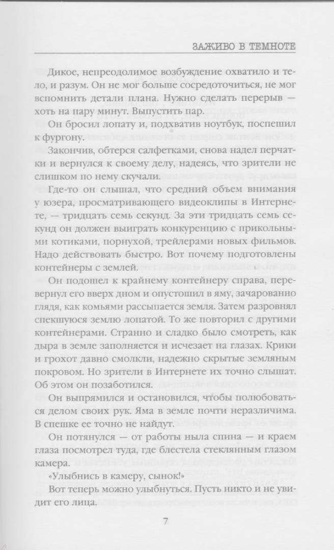 ОписаниеПродолжение триллера "Внутри убийцы", бестселлера New York Times, Washington Post и Amazon Charts. Все серийные убийцы вырастают из маленьких ангелочков… Он - убийца-экспериментатор. Она - следователь-профайлер. Они обязательно встретятся… Профайлер… Криминальный психолог, буквально по паре незначительных деталей способный воссоздать облик и образ действий самого хитроумного преступника. Эти люди выглядят со стороны как волшебники, как супергерои. Тем более если профайлер - женщина… Николь приходит в себя - и понимает, что находится в полной темноте, в небольшом замкнутом пространстве. Ее локти и колени упираются в шершавые доски. Почти нечем дышать. Все звуки раздаются глухо, словно под землей… Под землей?! Она похоронена заживо. Николь начинает кричать и биться в своем гробу. От ужаса перехватывает горло, она ничего не соображает, кроме одного - что выхода отсюда у нее нет. И не замечает, что к доскам над ней прикреплена маленькая инфракрасная видеокамера… Идет прямая интернет-трансляция. В это же время "гробовое" видео смотрят профайлер ФБР Зои Бентли и специальный агент Тейтум Грей. Рядом с изображением подпись - "Эксперимент № 1". Они понимают: объявился новый серийный маньяк-убийца - и обязательно будет эксперимент № 2… Второй роман из серии книг о Зои Бентли. Особенности издания: вырубка на первой сторонке переплета, блинтовое тиснение, лак, запечатанные форзац и нахзац, качественная белая офсетная бумага блока текста."Продолжение триллера «ВНУТРИ УБИЙЦЫ», бестселлера New York Times, Washington Post и Amazon Charts.